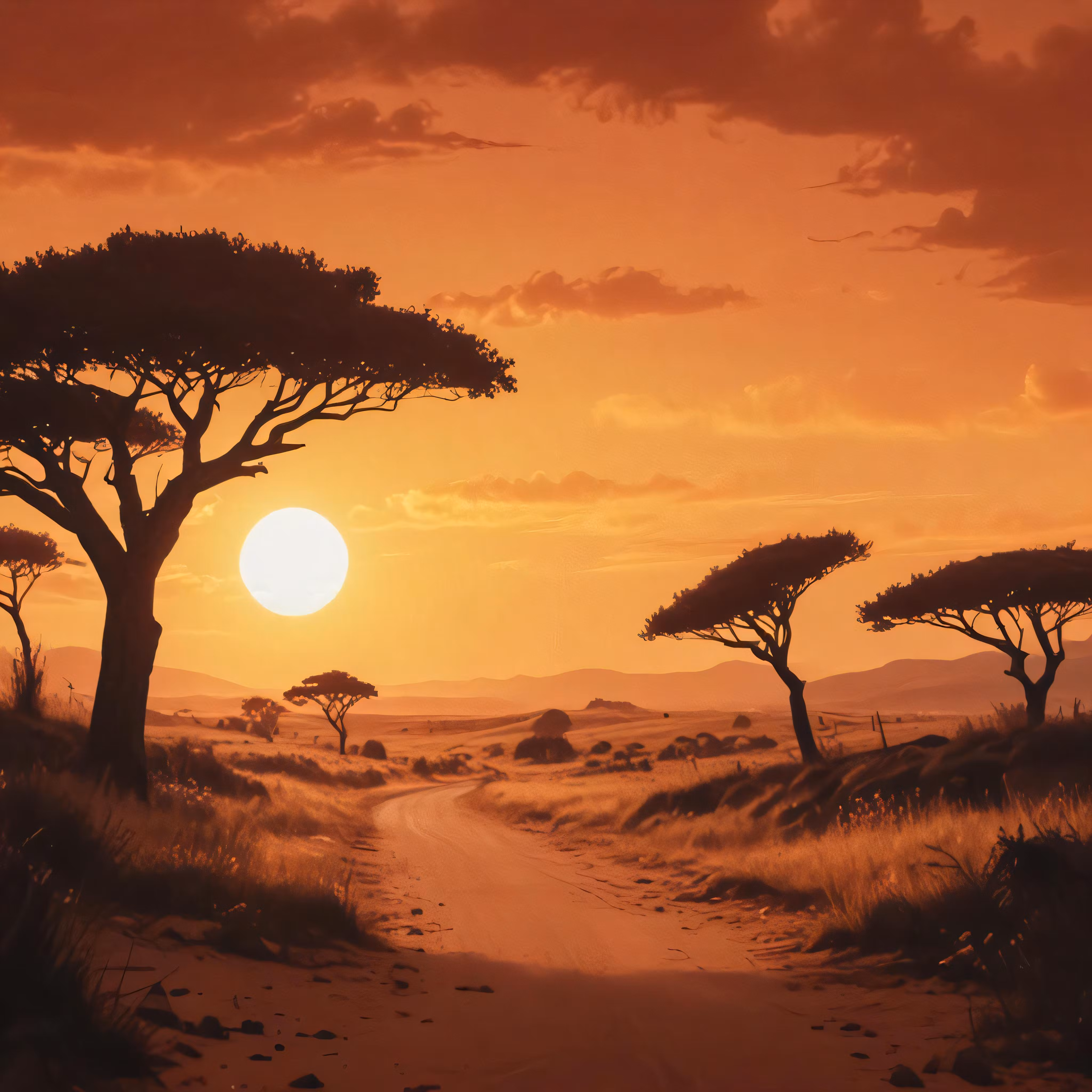 High resolution picture, free to use, the sun is setting behind several trees in the savannah