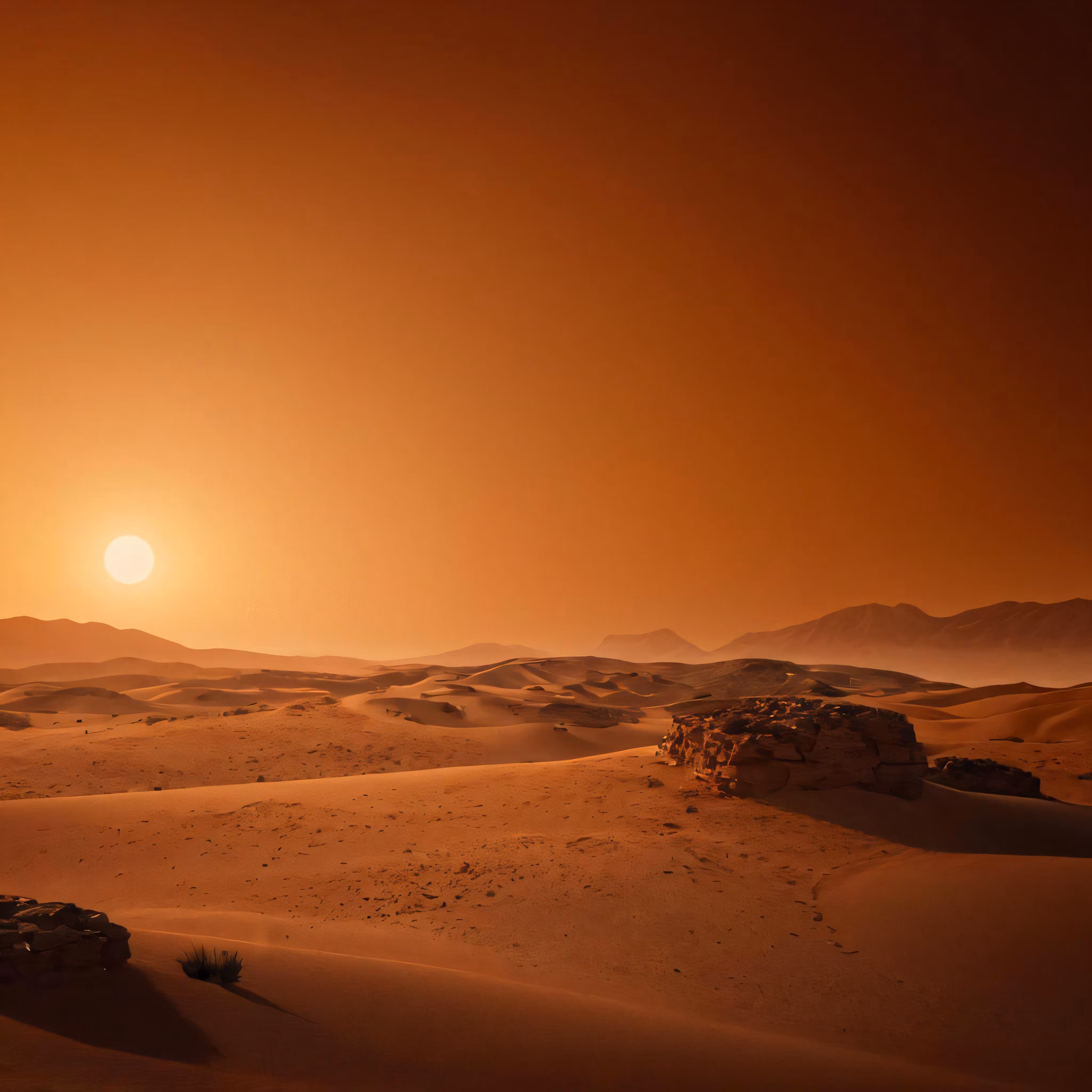 High resolution picture, free to use, the sun sets over the desert terrain on the horizon