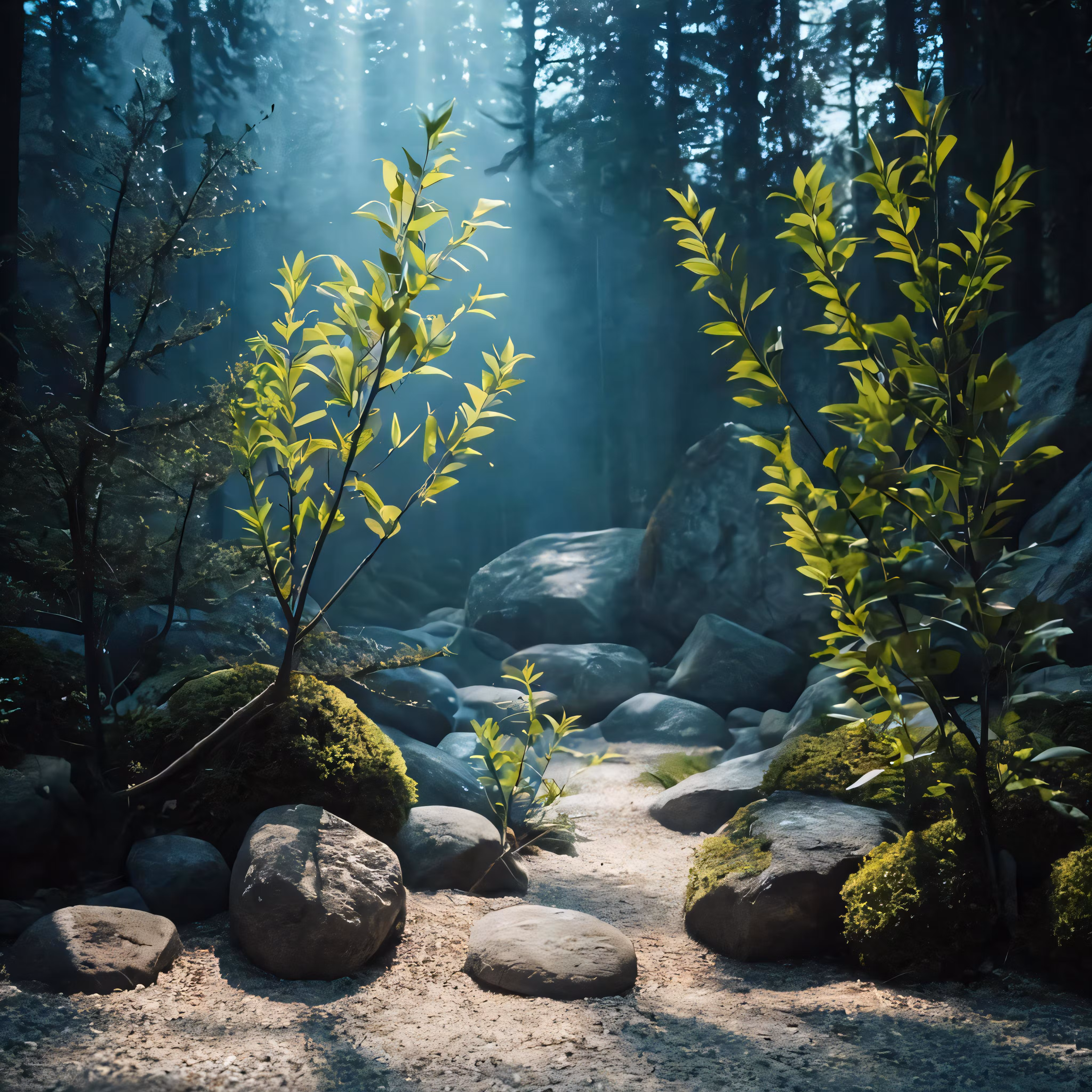 High resolution picture, free to use, the sun shines through some green plants and rocks
