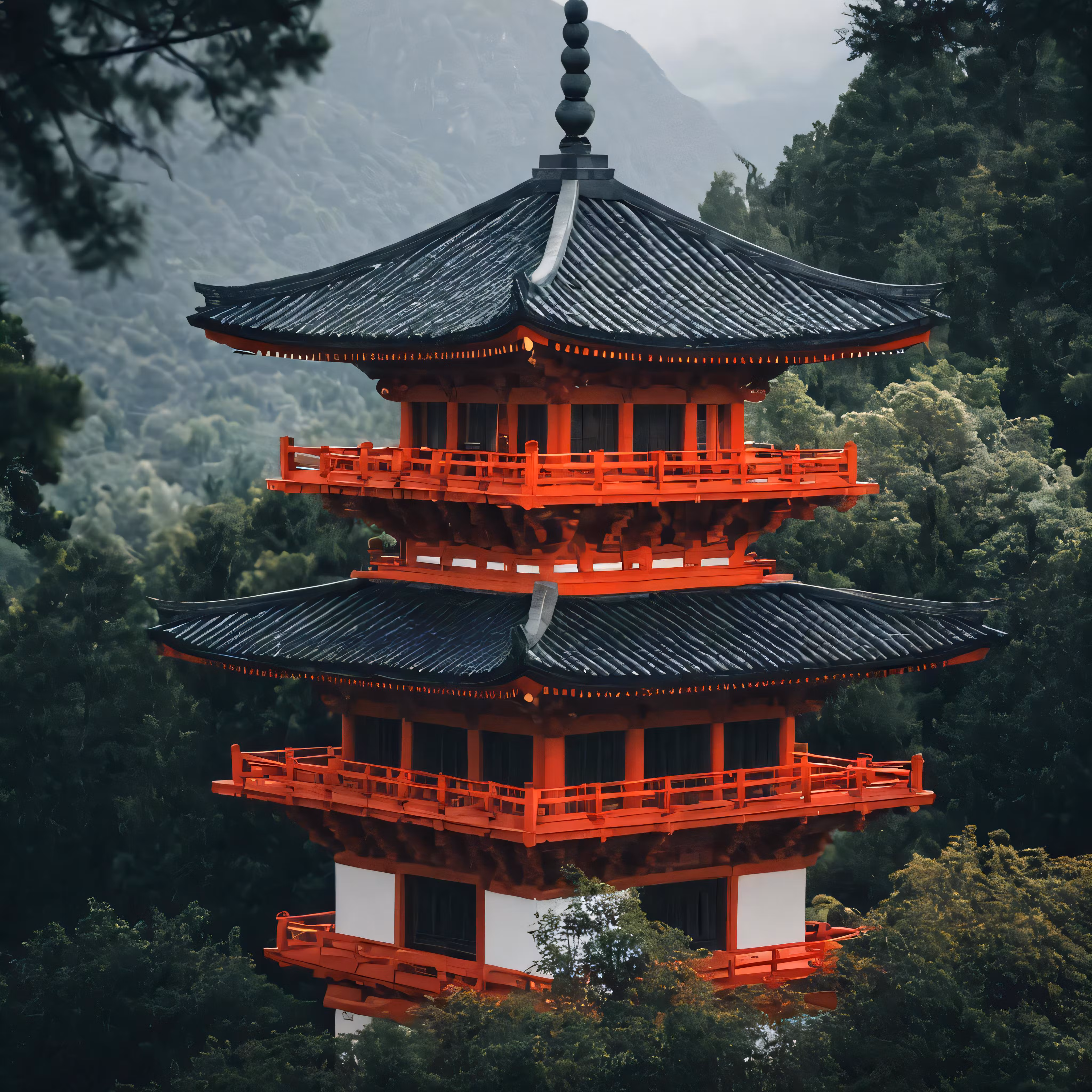 High resolution picture, free to use, the tall red and white pagoda stands in front of some trees