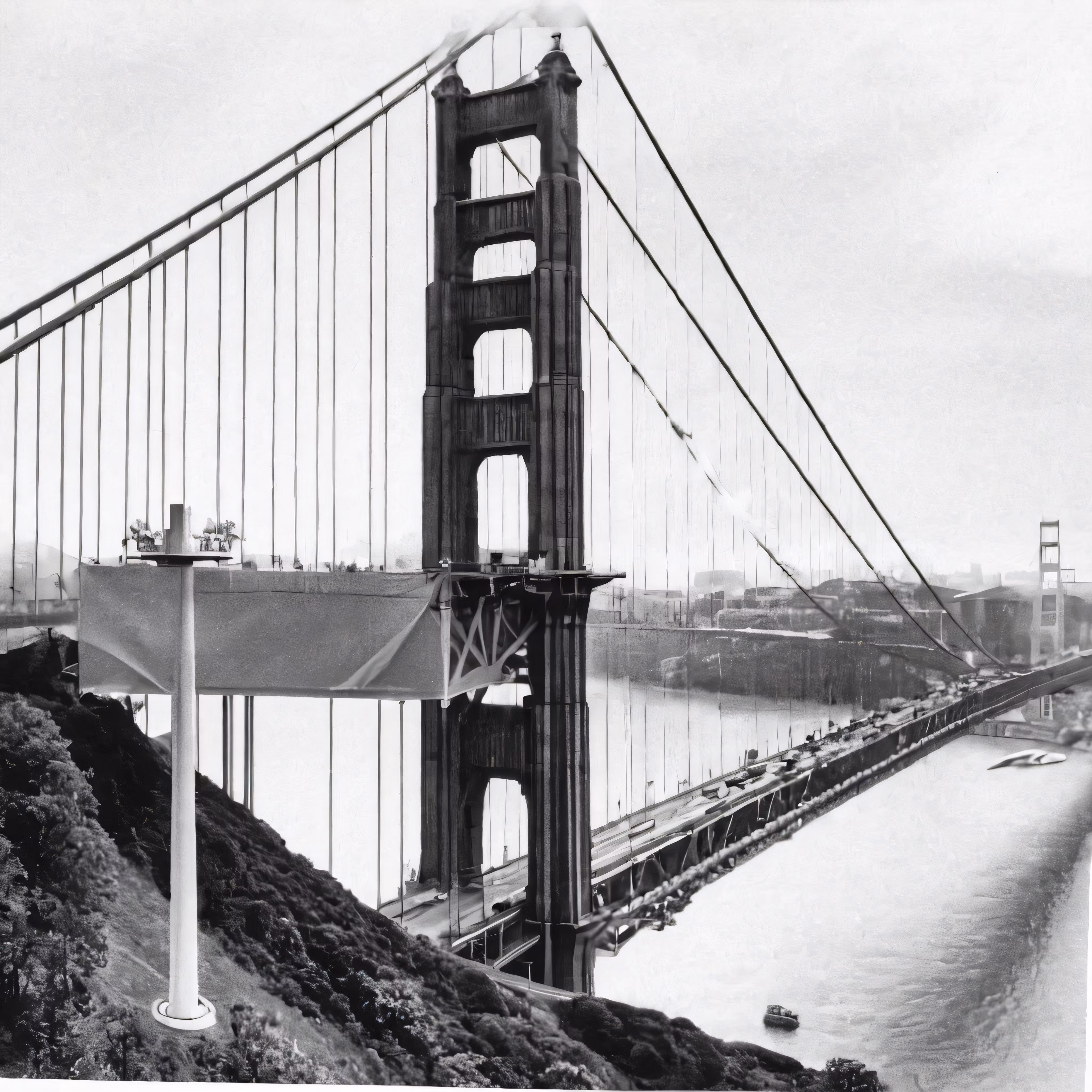 High resolution picture, free to use, the view of a bridge across a large river from atop of the hill