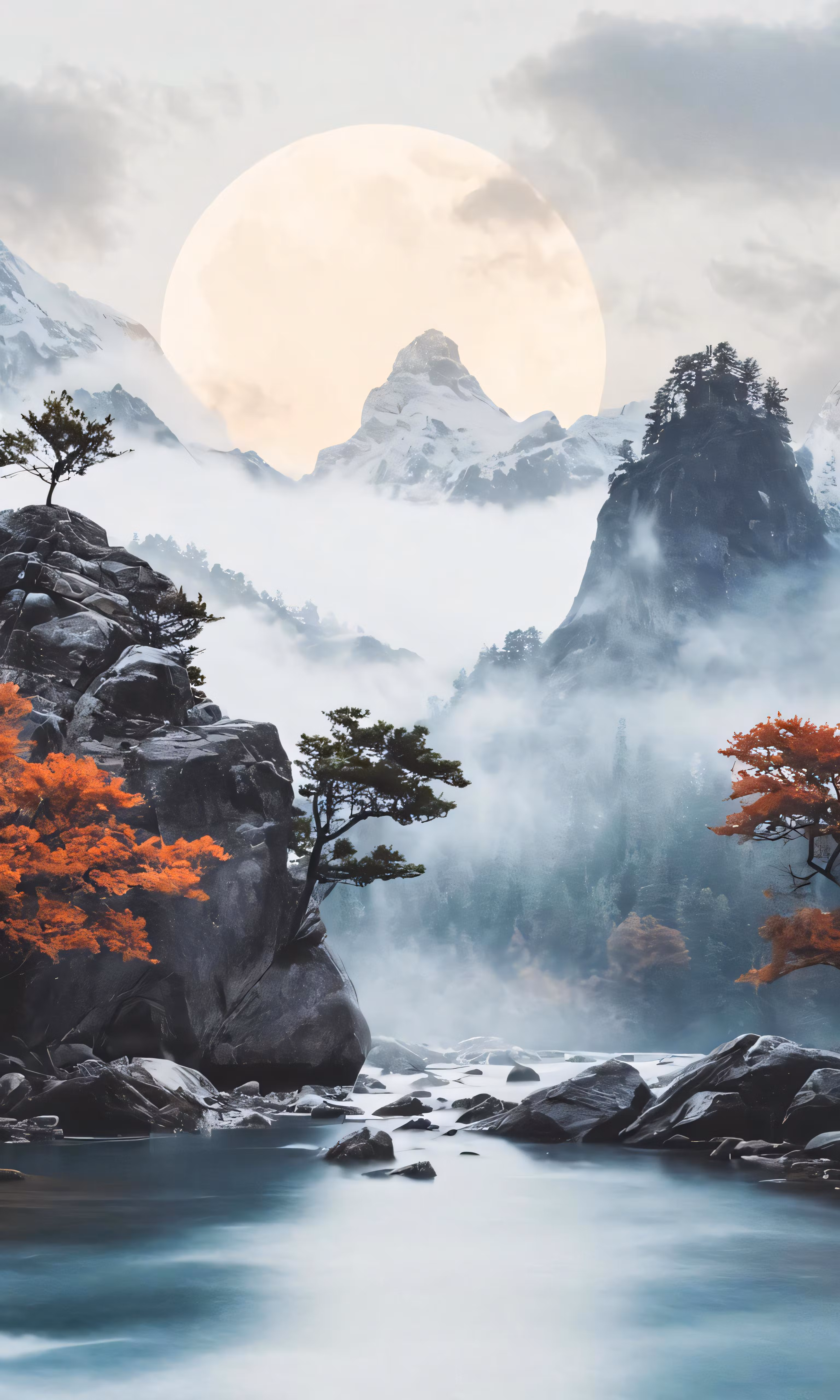 High resolution picture, free to use, the view of trees and mountains from the river with fog