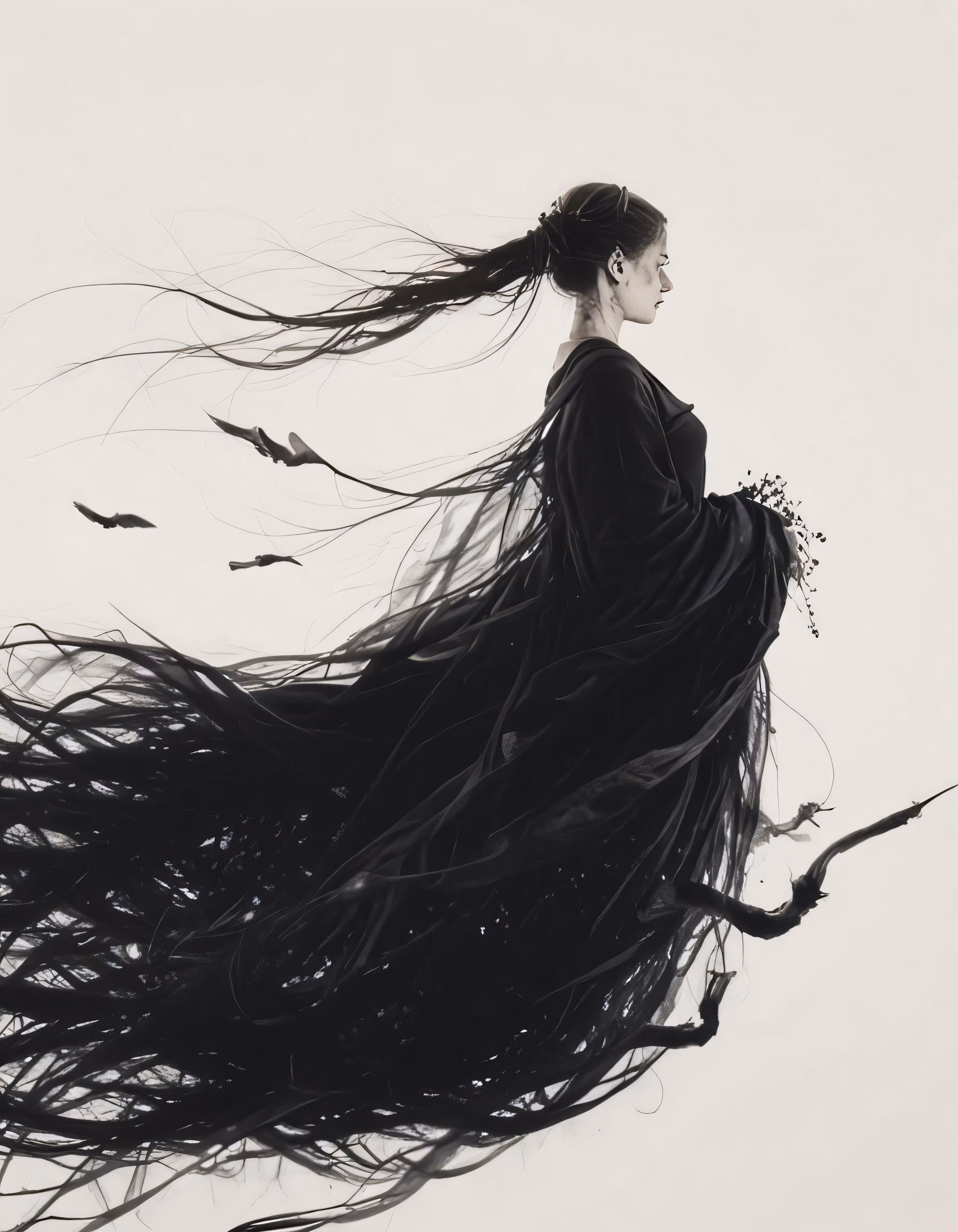 High resolution picture, free to use, the woman in the black dress is flying with feathers