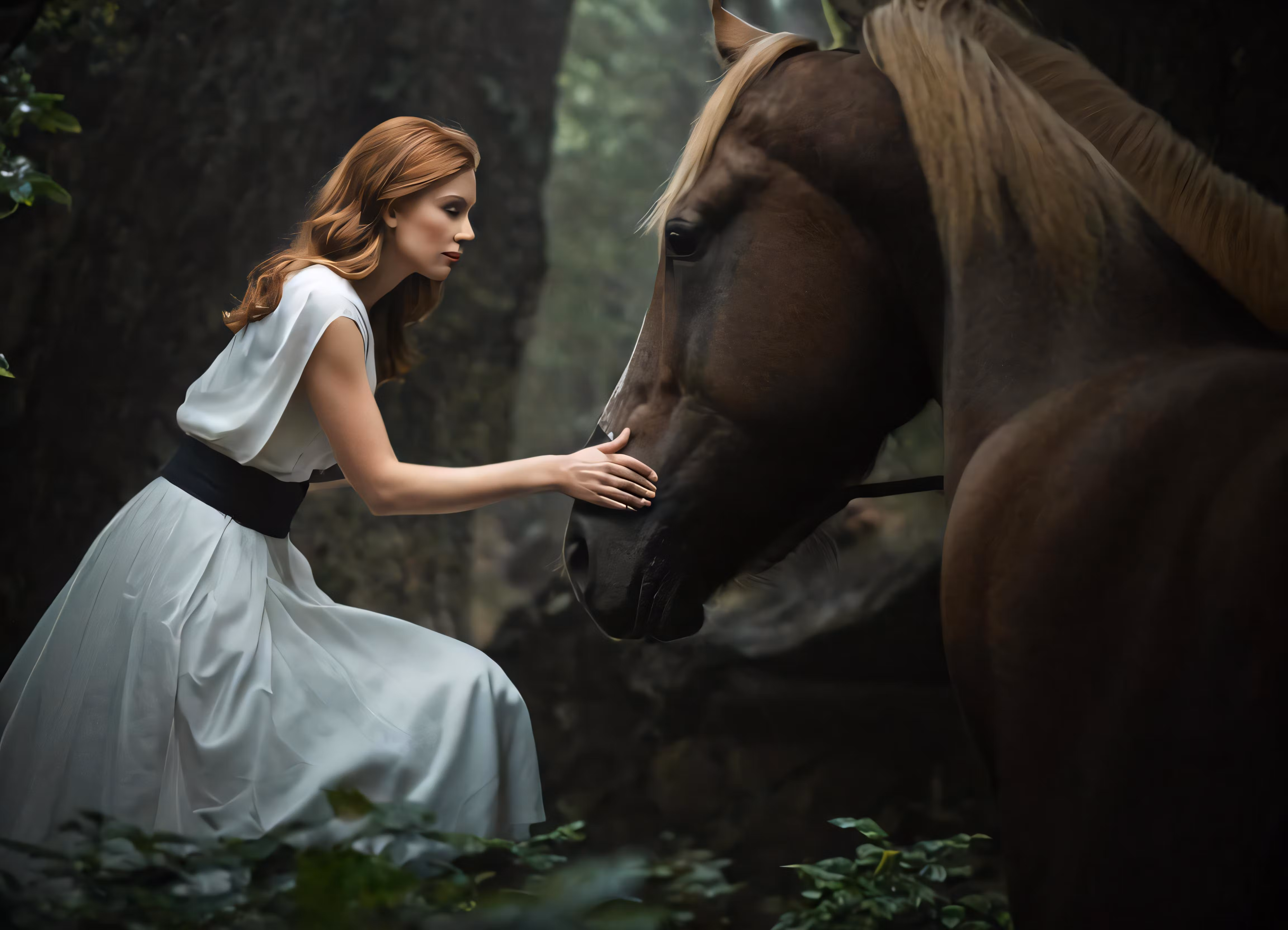 High resolution picture, free to use, the woman in white has her hand on a horse