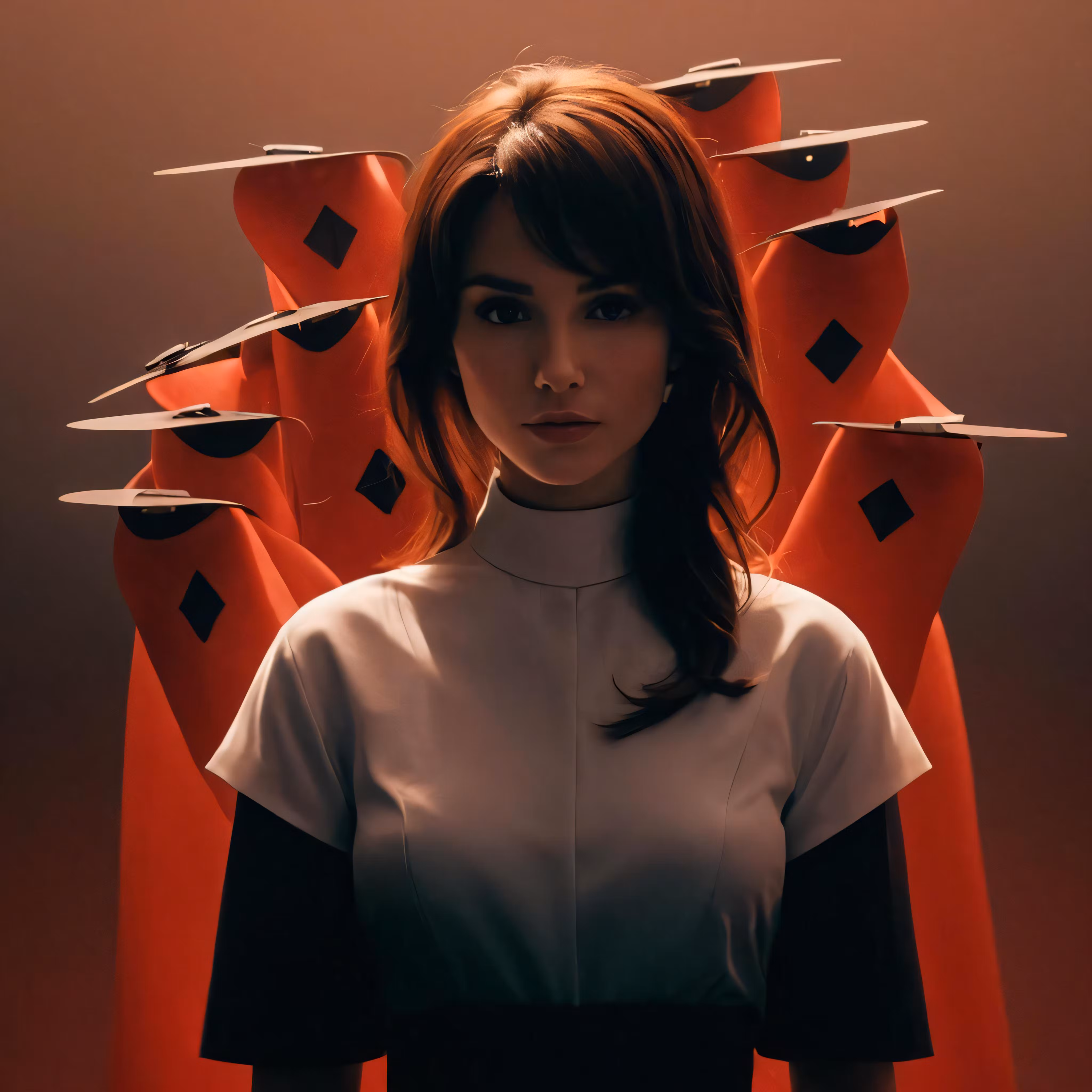 High resolution picture, free to use, the woman is posing for a photo with her back turned to look like she has multiple identical rows of red vases