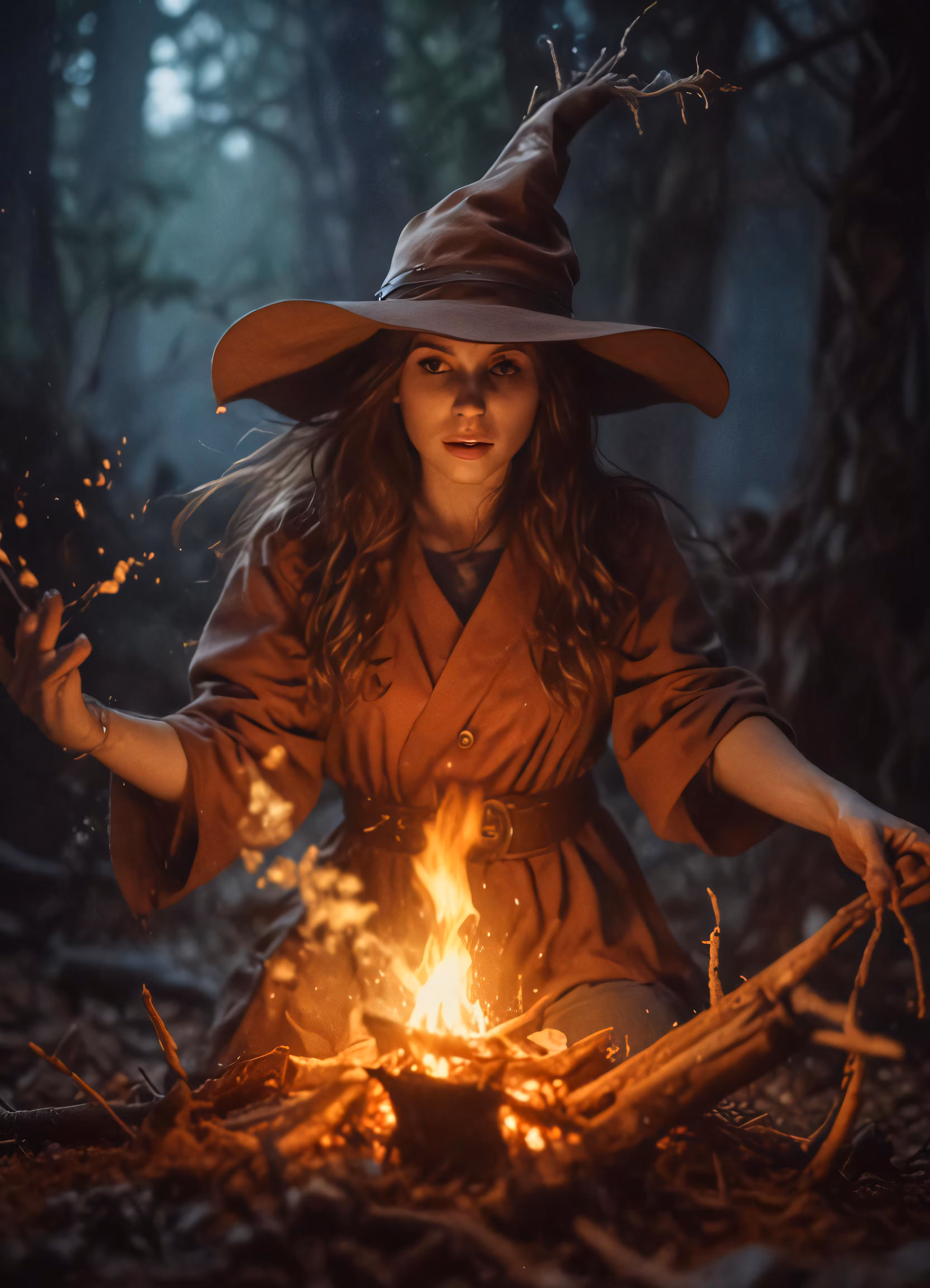 High resolution picture, free to use, the woman is standing in a forest near a fire