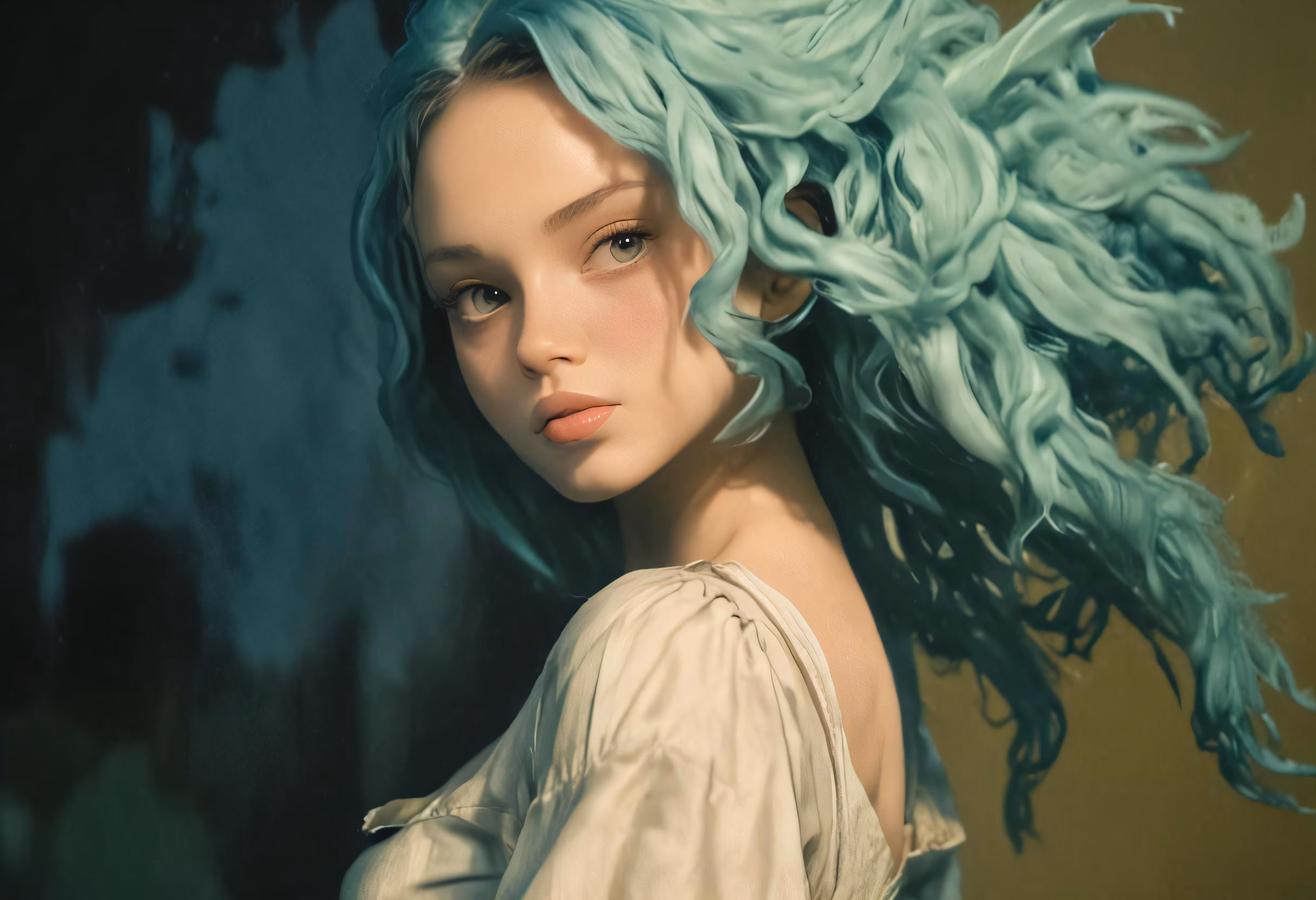 High resolution picture, free to use, the woman with green hair looks off to the side