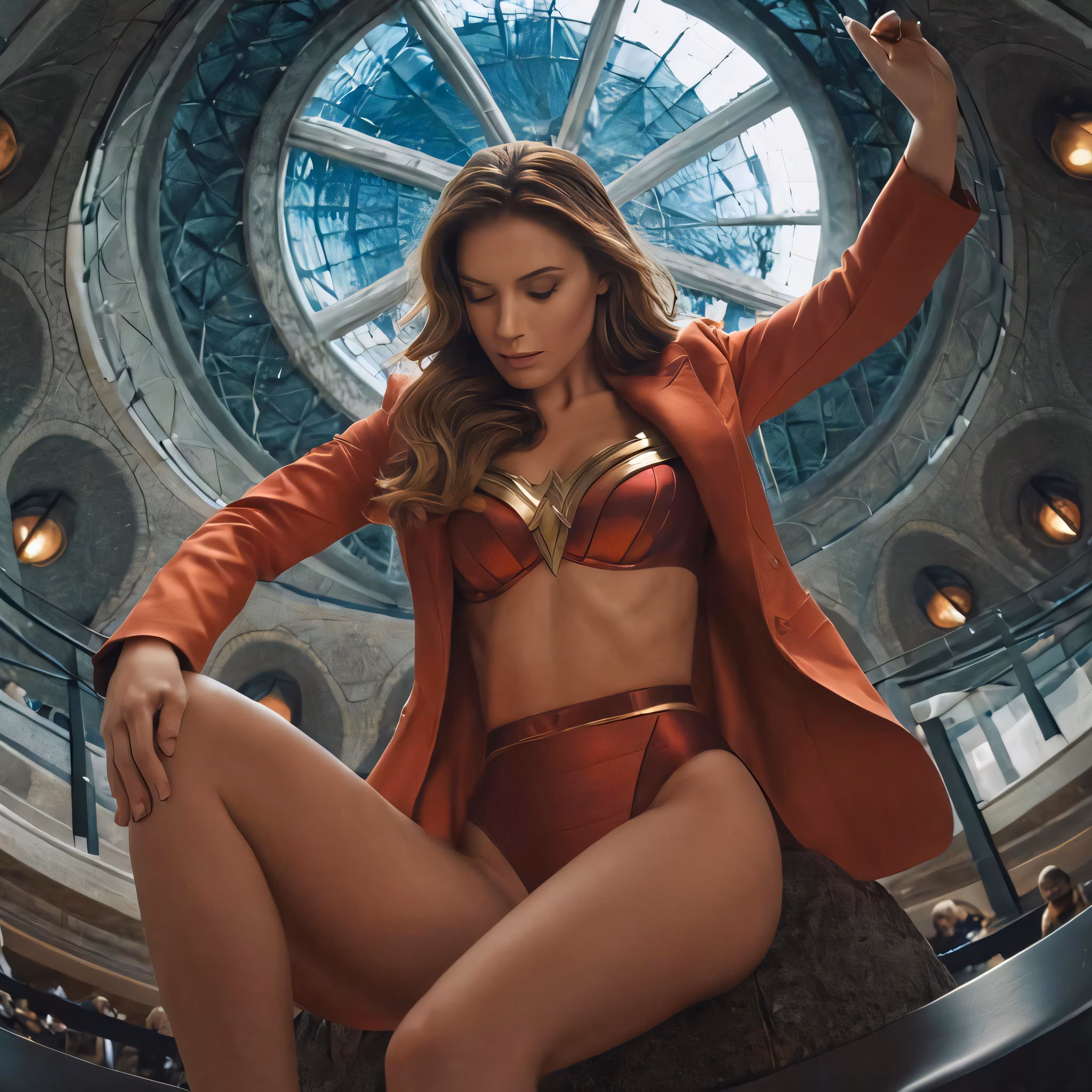 High resolution picture, free to use, the wonder woman is sitting in front of a huge clock