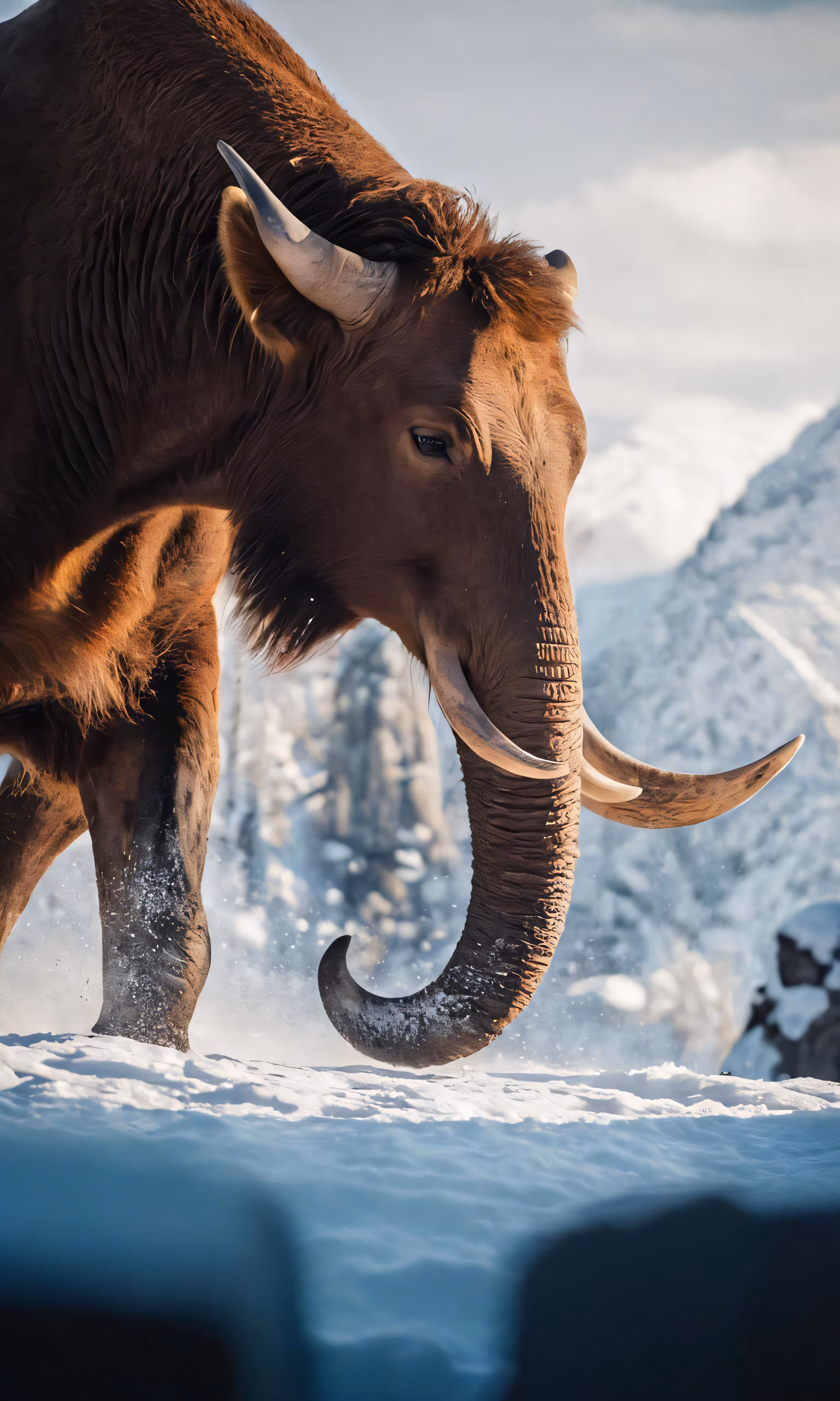 High resolution picture, free to use, the woolly mammoth stands in front of the snowy mountains