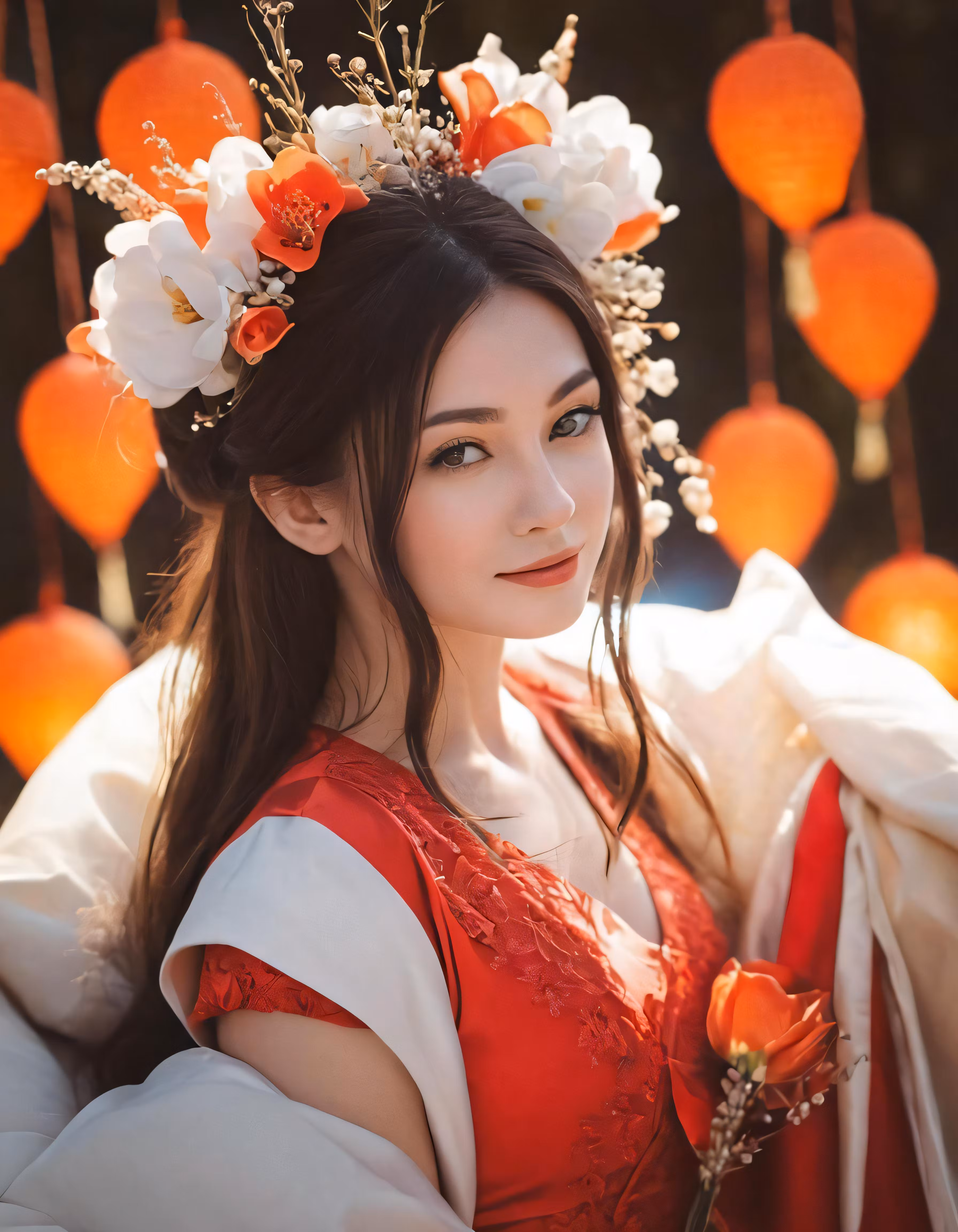 High resolution picture, free to use, the young woman in an asian hanboi dress wears a flower crown