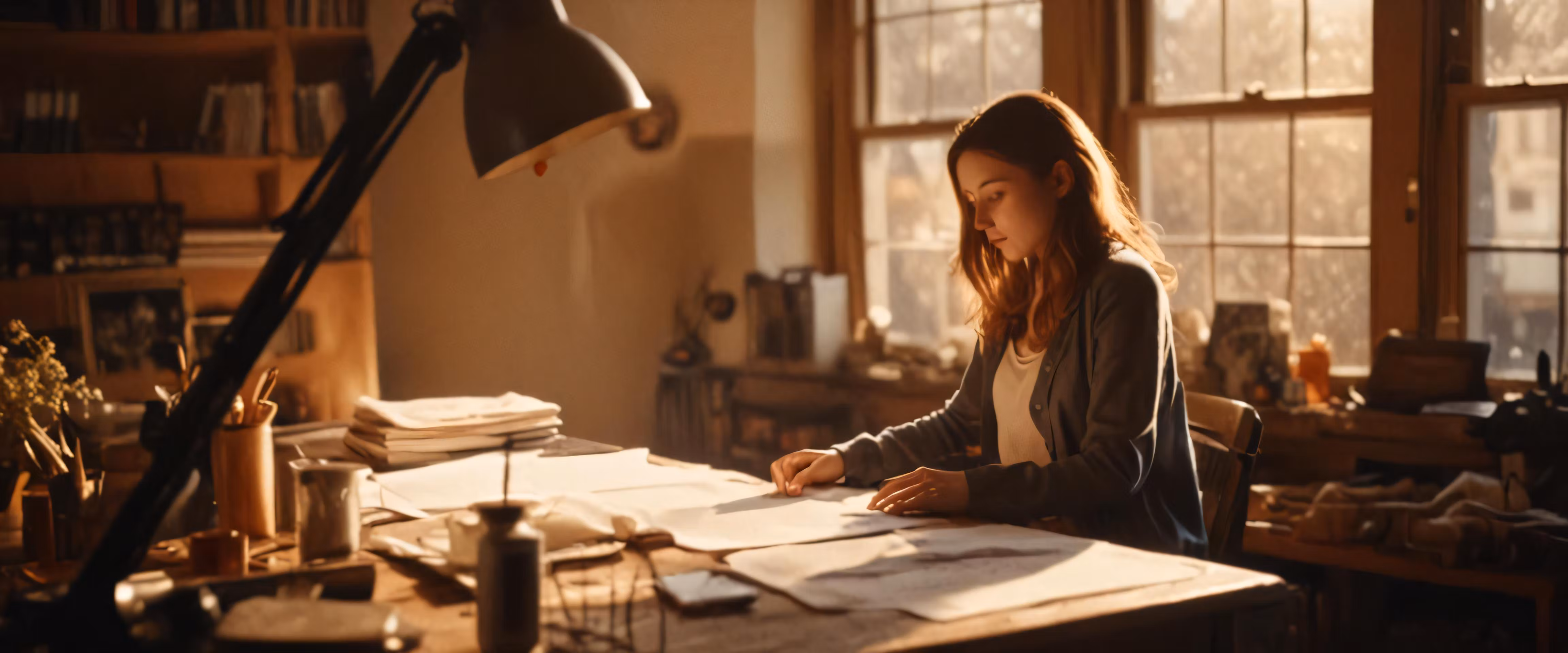High resolution picture, free to use, the young woman is sitting at a desk in front of a window