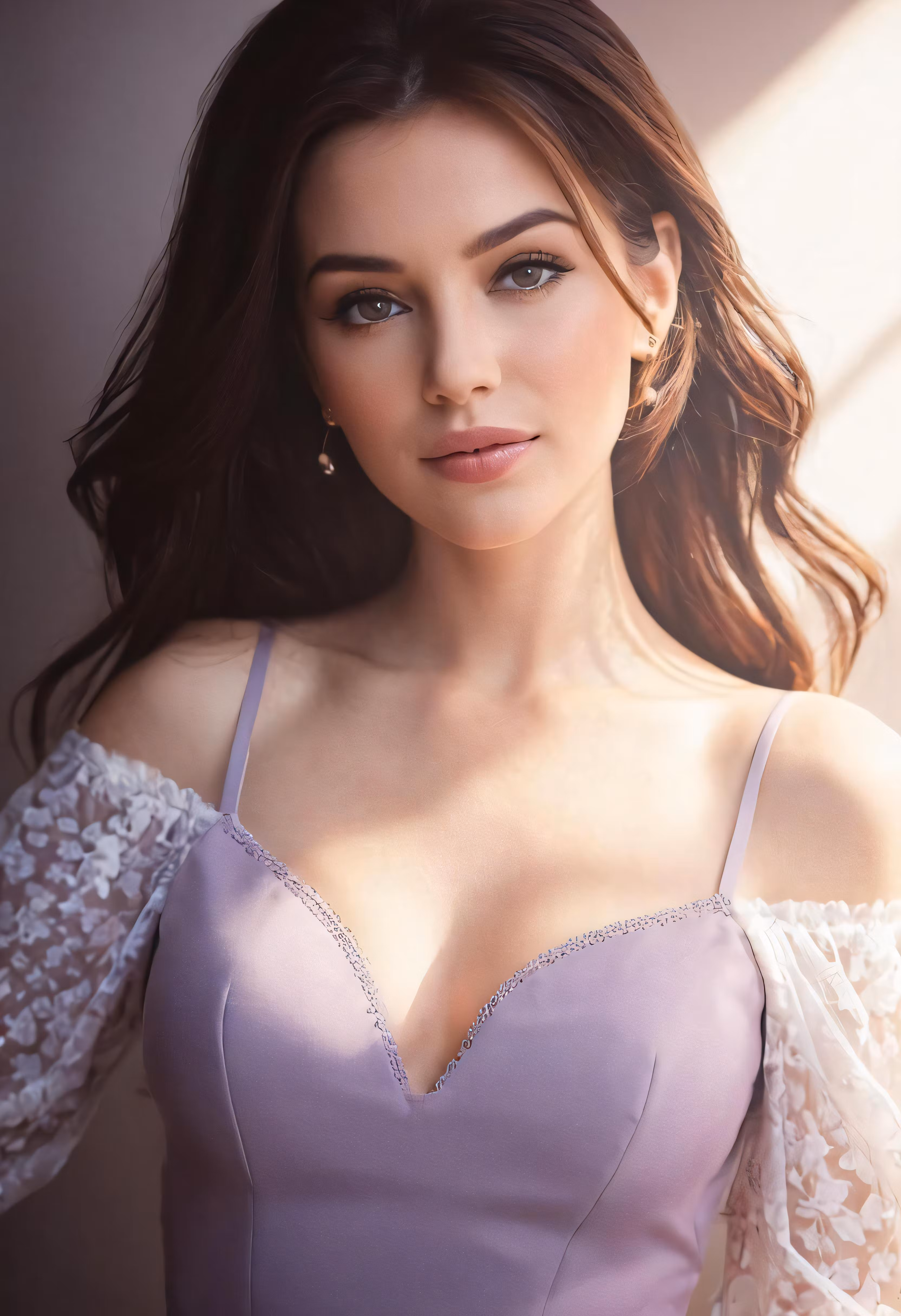 High resolution picture, free to use, the young woman is wearing a purple dress and posing for the camera