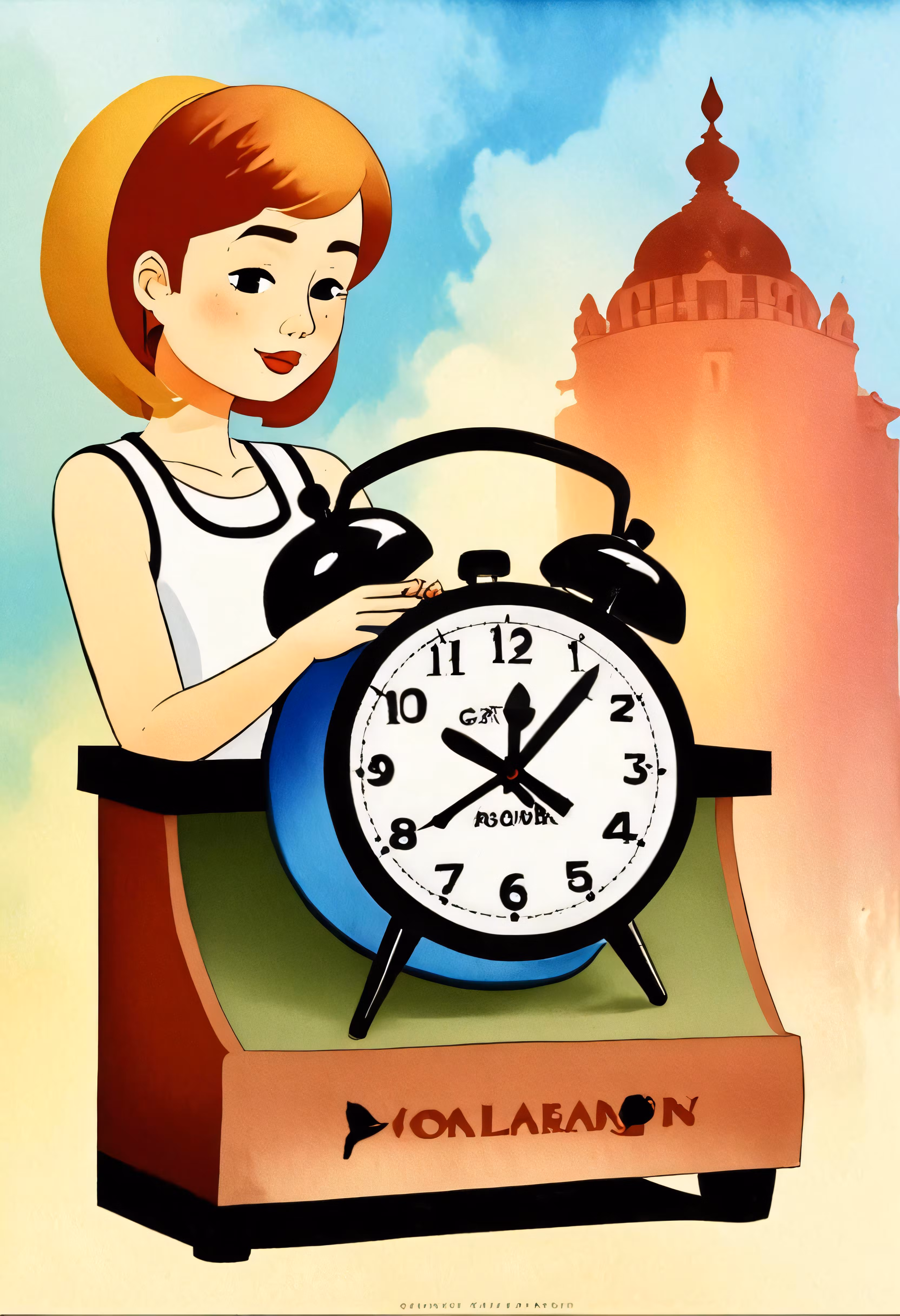 High resolution picture, free to use, there is a cartoon of a girl adjusting an analog clock
