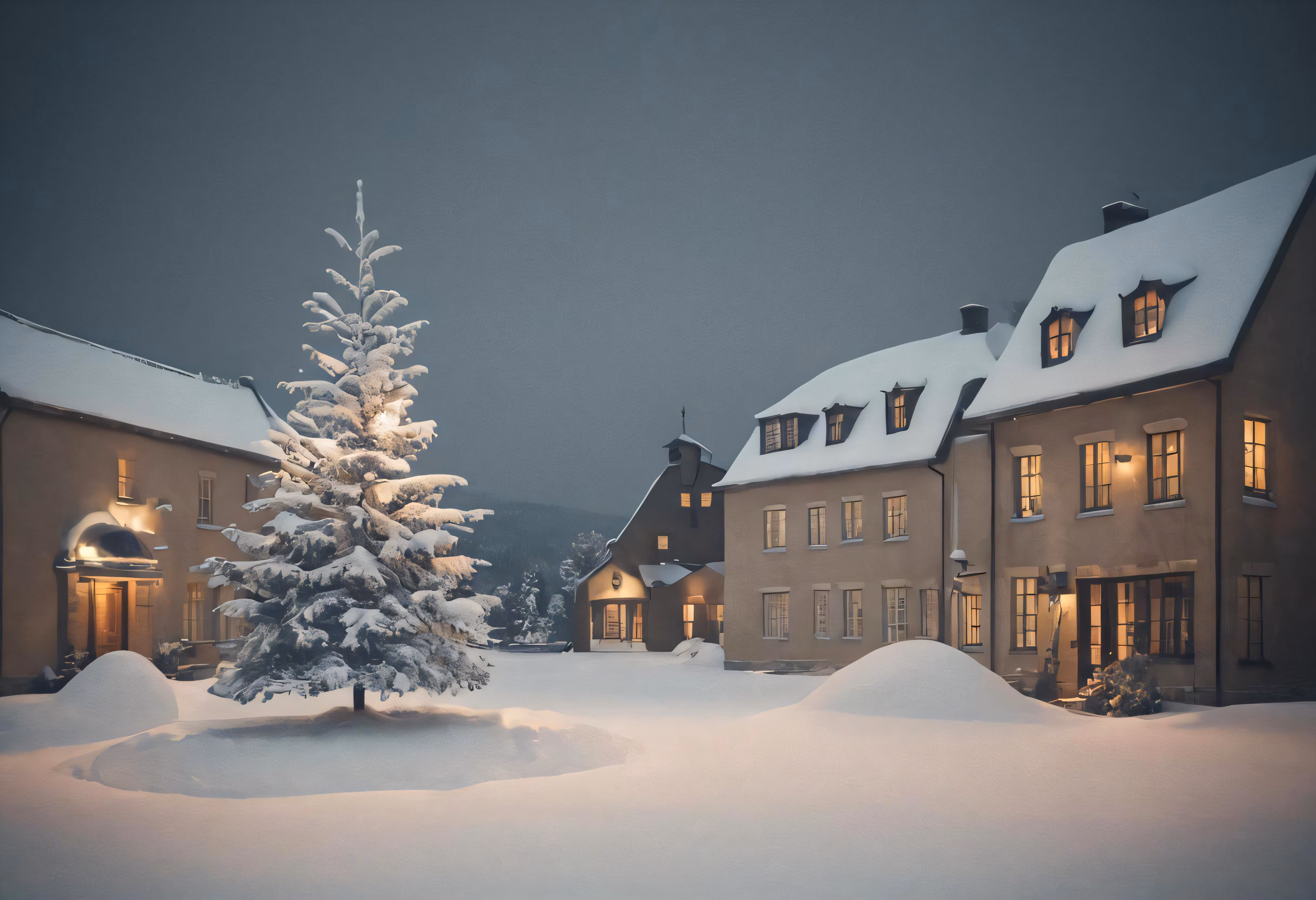 High resolution picture, free to use, there is a snow covered christmas tree in front of some houses