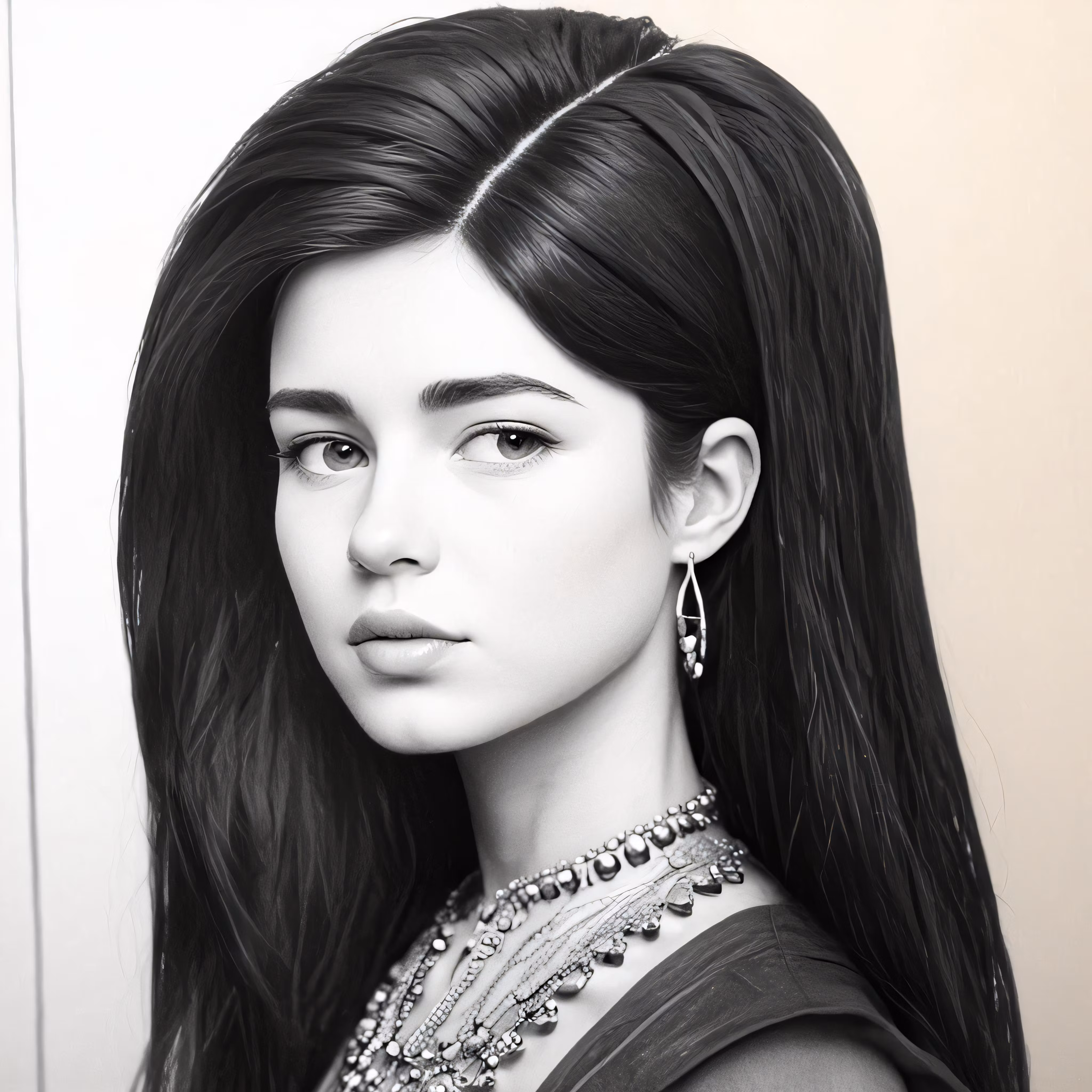 High resolution picture, free to use, this is a black and white drawing of a girl with long hair