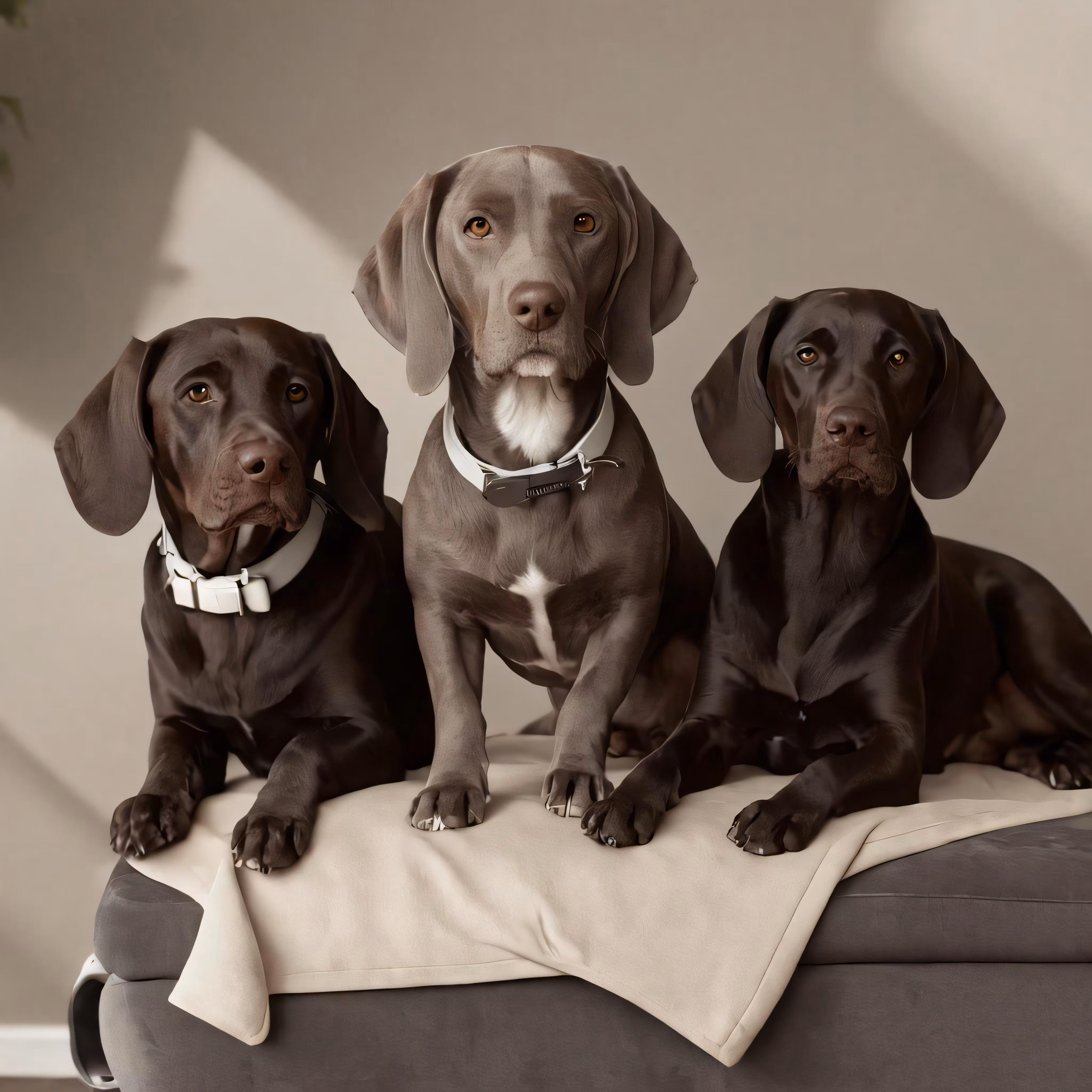 High resolution picture, free to use, three chocolate colored dogs sitting on top of a dog bed