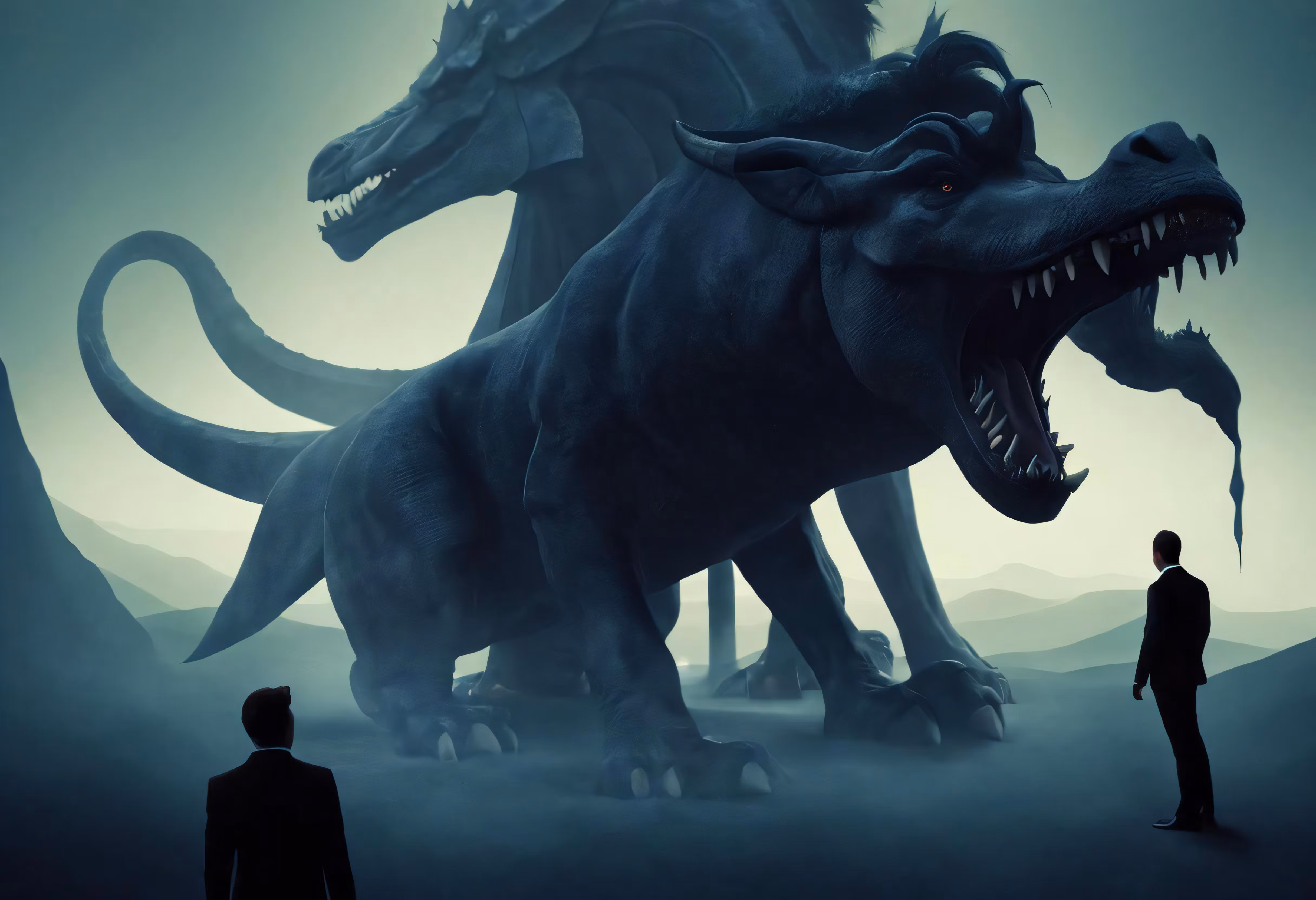 High resolution picture, free to use, three dark dinosaurs are standing in front of a man in black clothes
