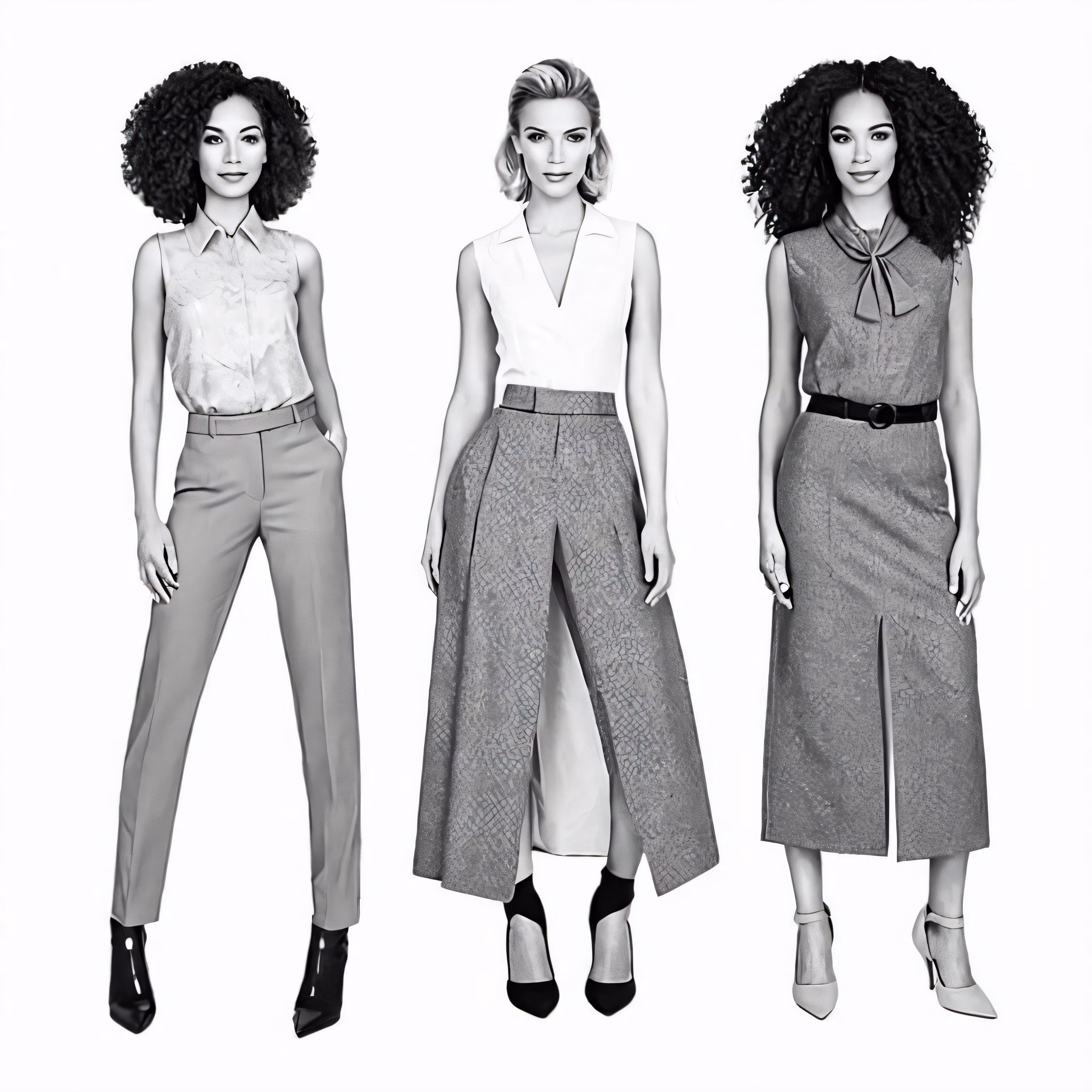 High resolution picture, free to use, three ladies wearing pants and high heels standing in front of white background