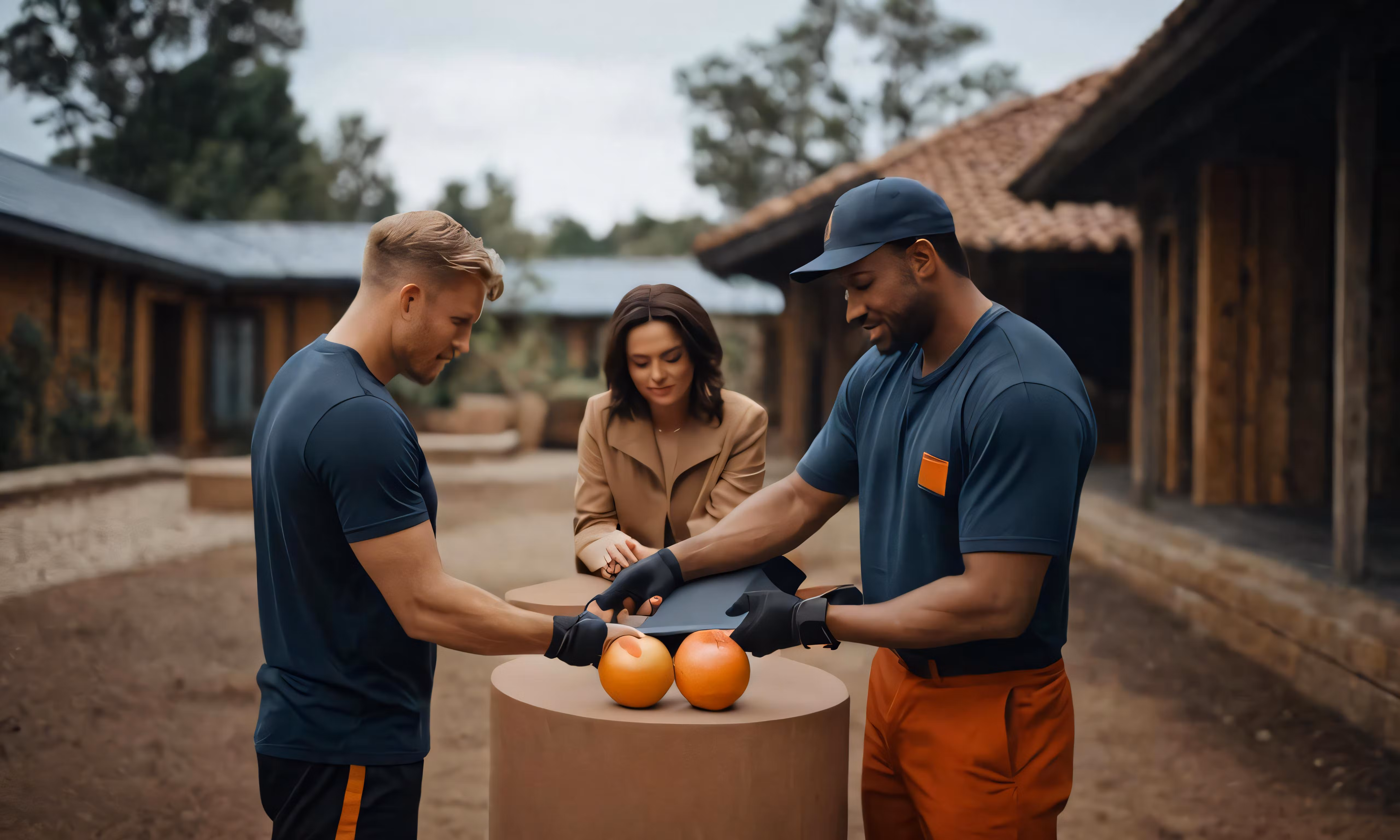 High resolution picture, free to use, three people are cutting oranges on a post
