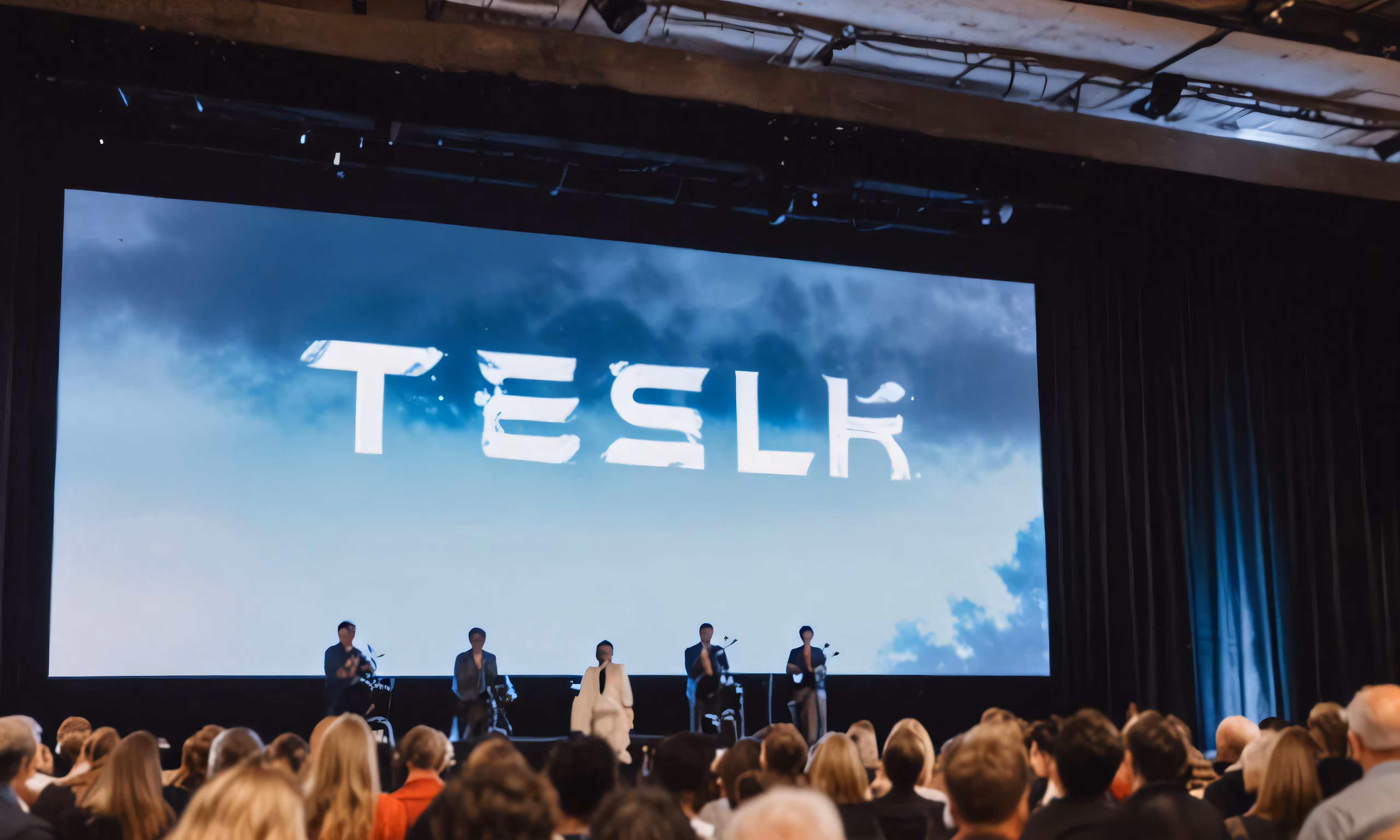 High resolution picture, free to use, three people standing in front of a large screen with a man standing on a stage speaking