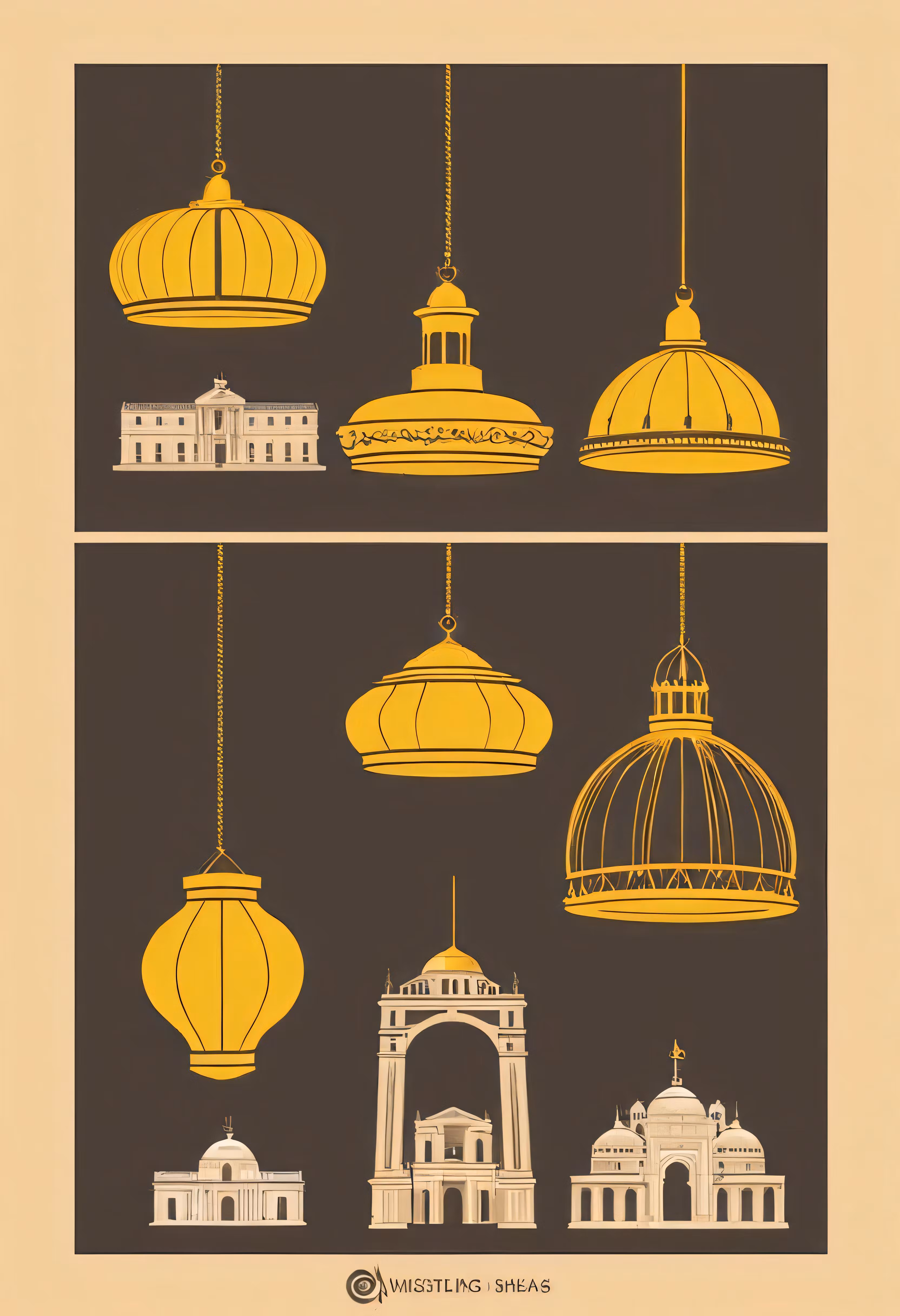 High resolution picture, free to use, three prints with different hanging lights and buildings