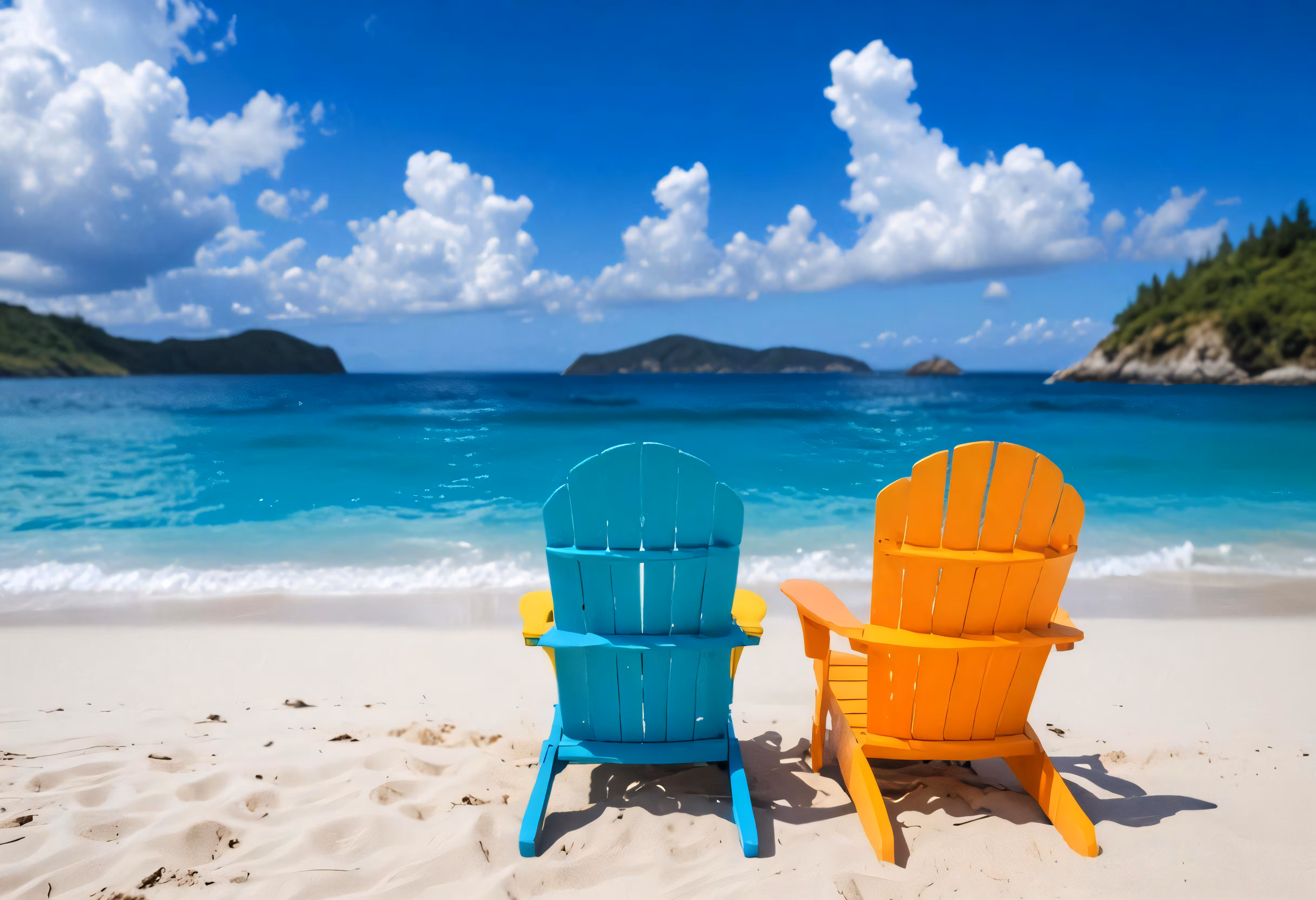 High resolution picture, free to use, two beach chairs sitting on the sand looking out at the ocean