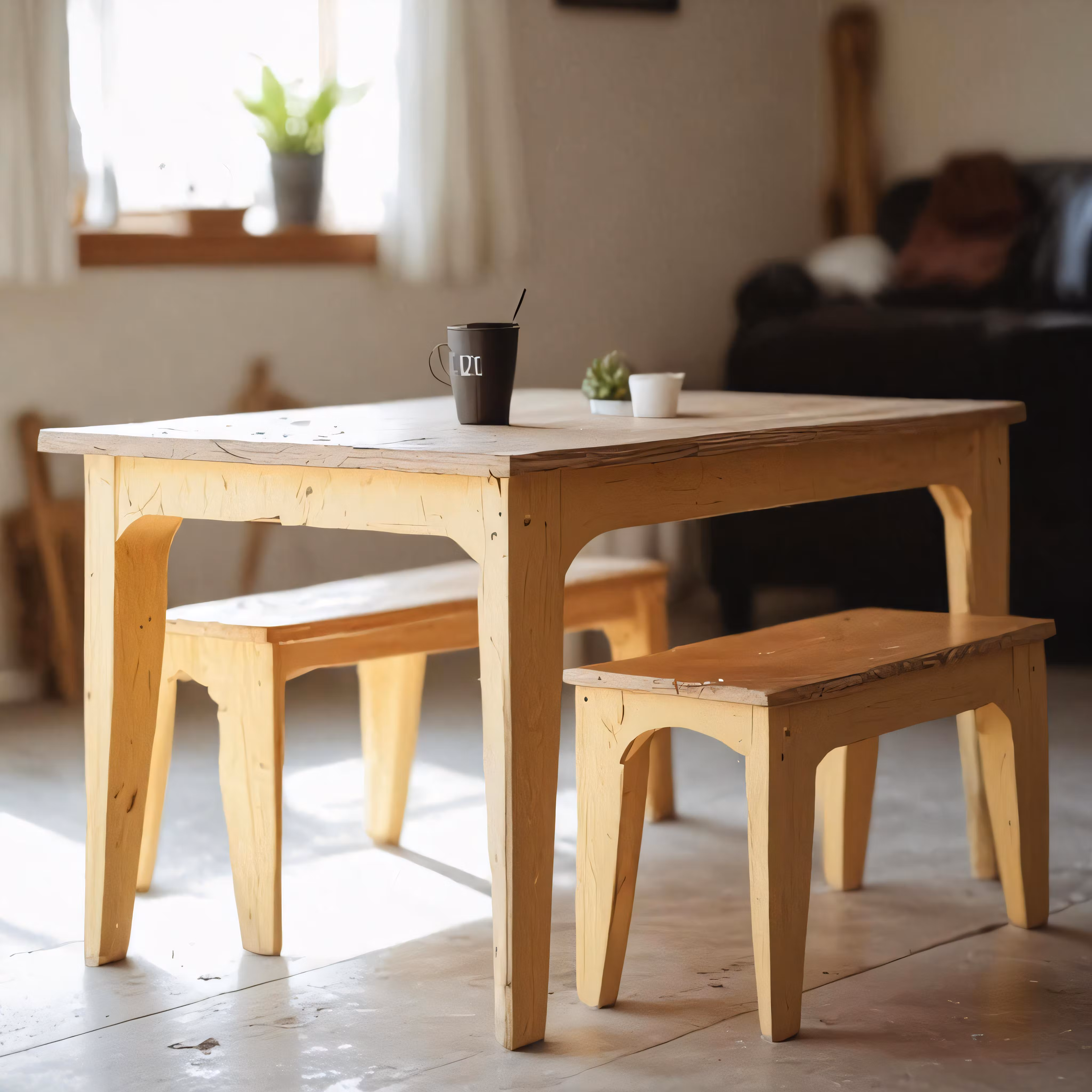 High resolution picture, free to use, two benches sit underneath a small wood table