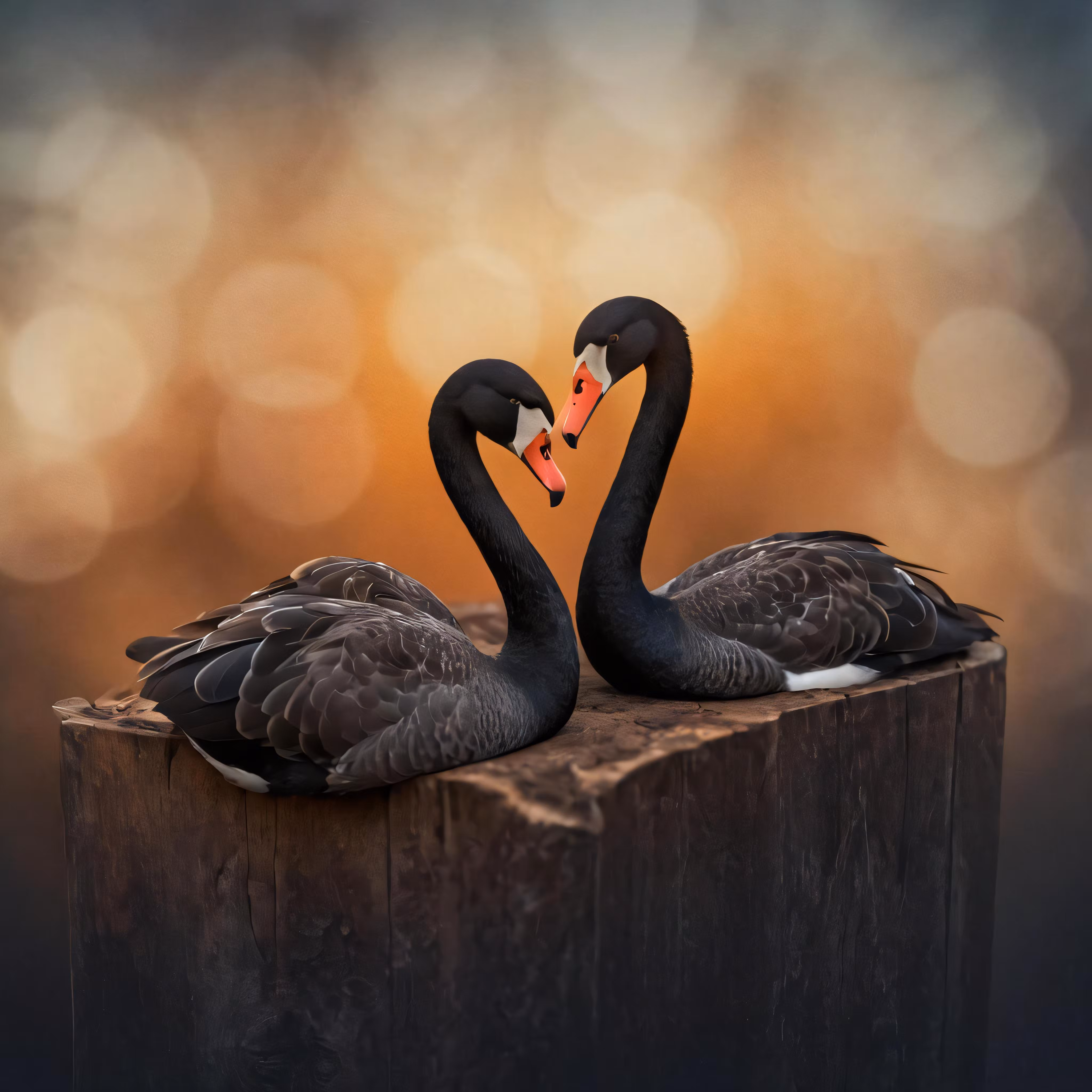 High resolution picture, free to use, two black swans, one touching his beaks, sitting on the edge of a wood post