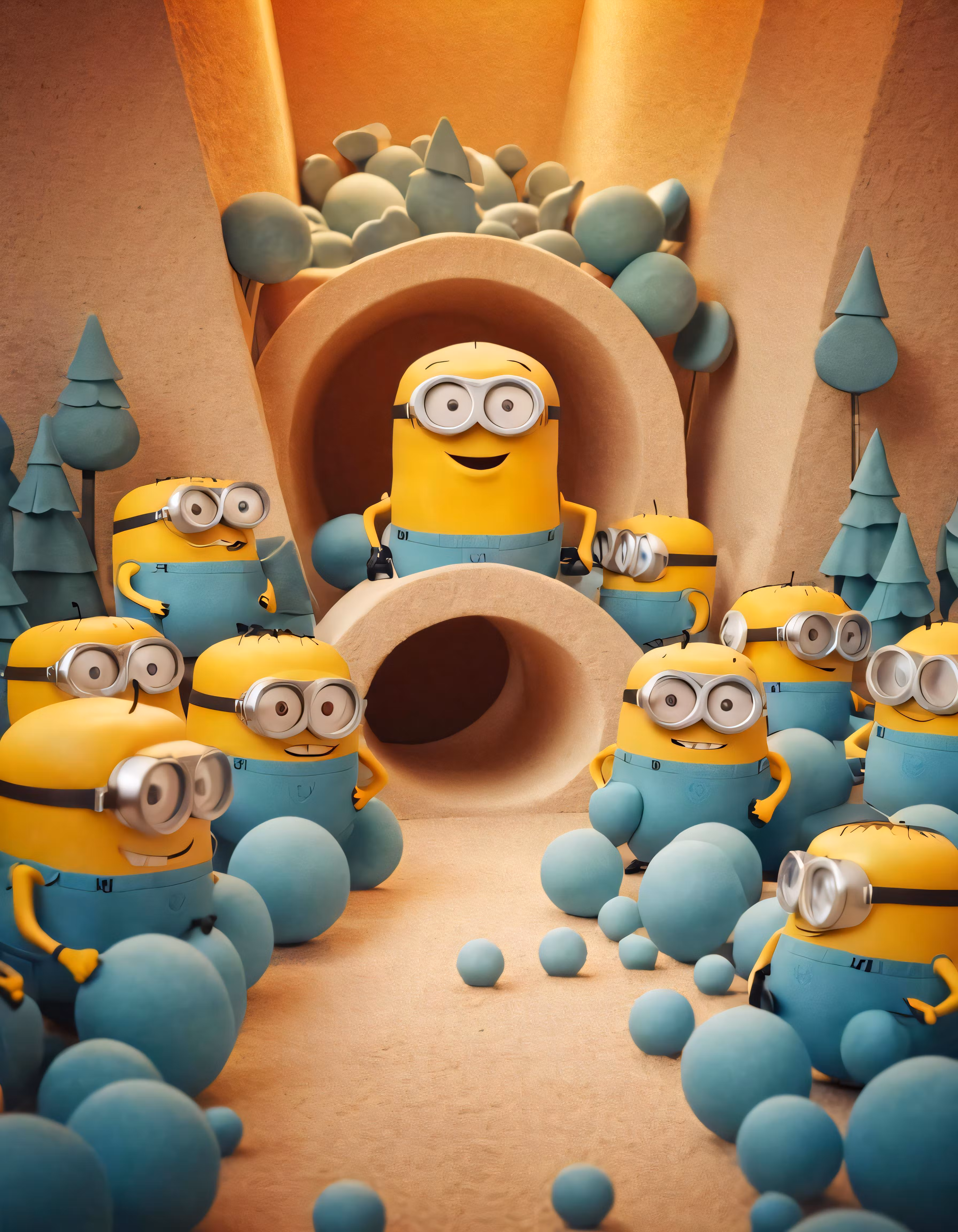 High resolution picture, free to use, two cartoon figures are standing next to each other in front of some blue and yellow trees