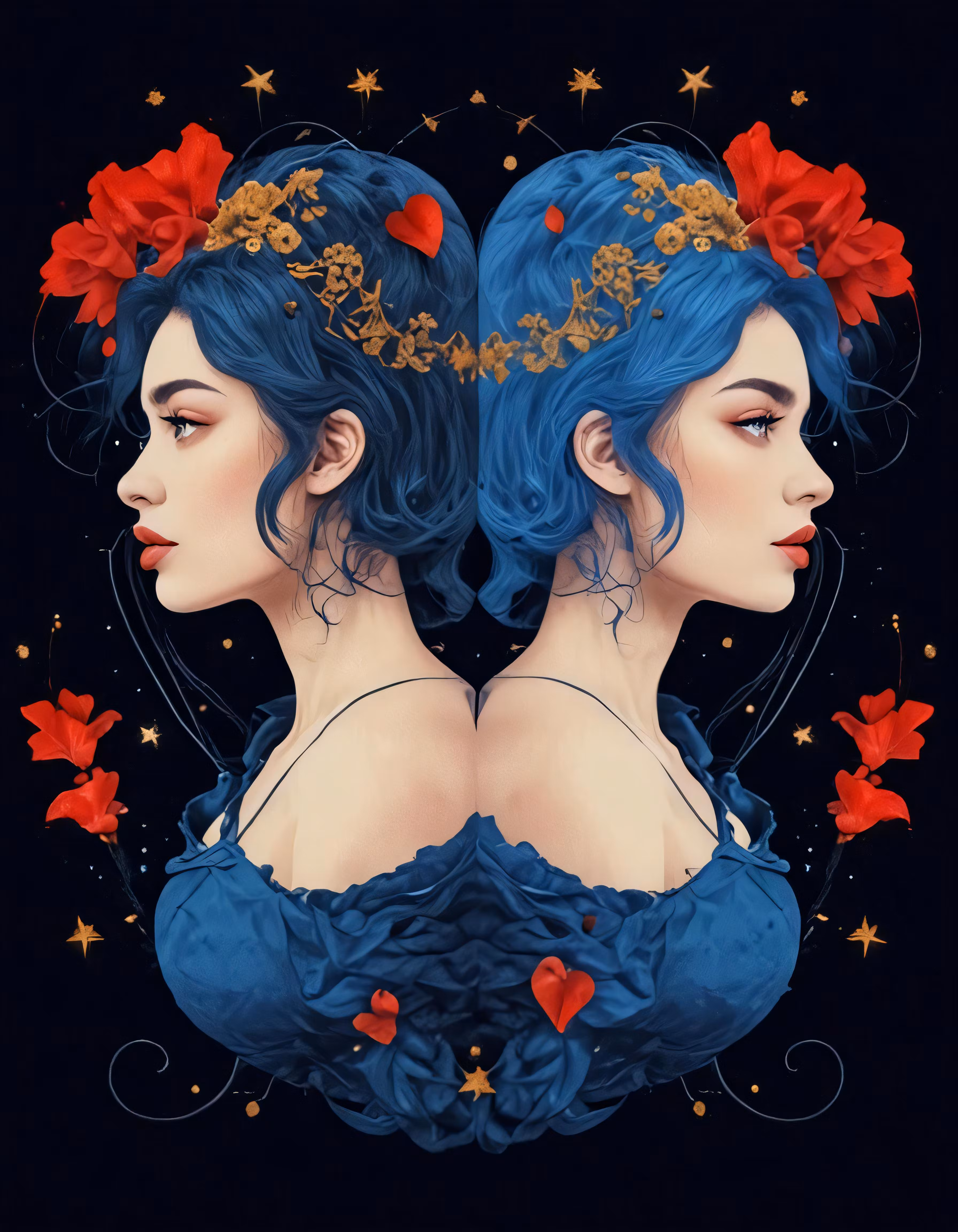 High resolution picture, free to use, two faces with blue hair wearing red flowers on their head