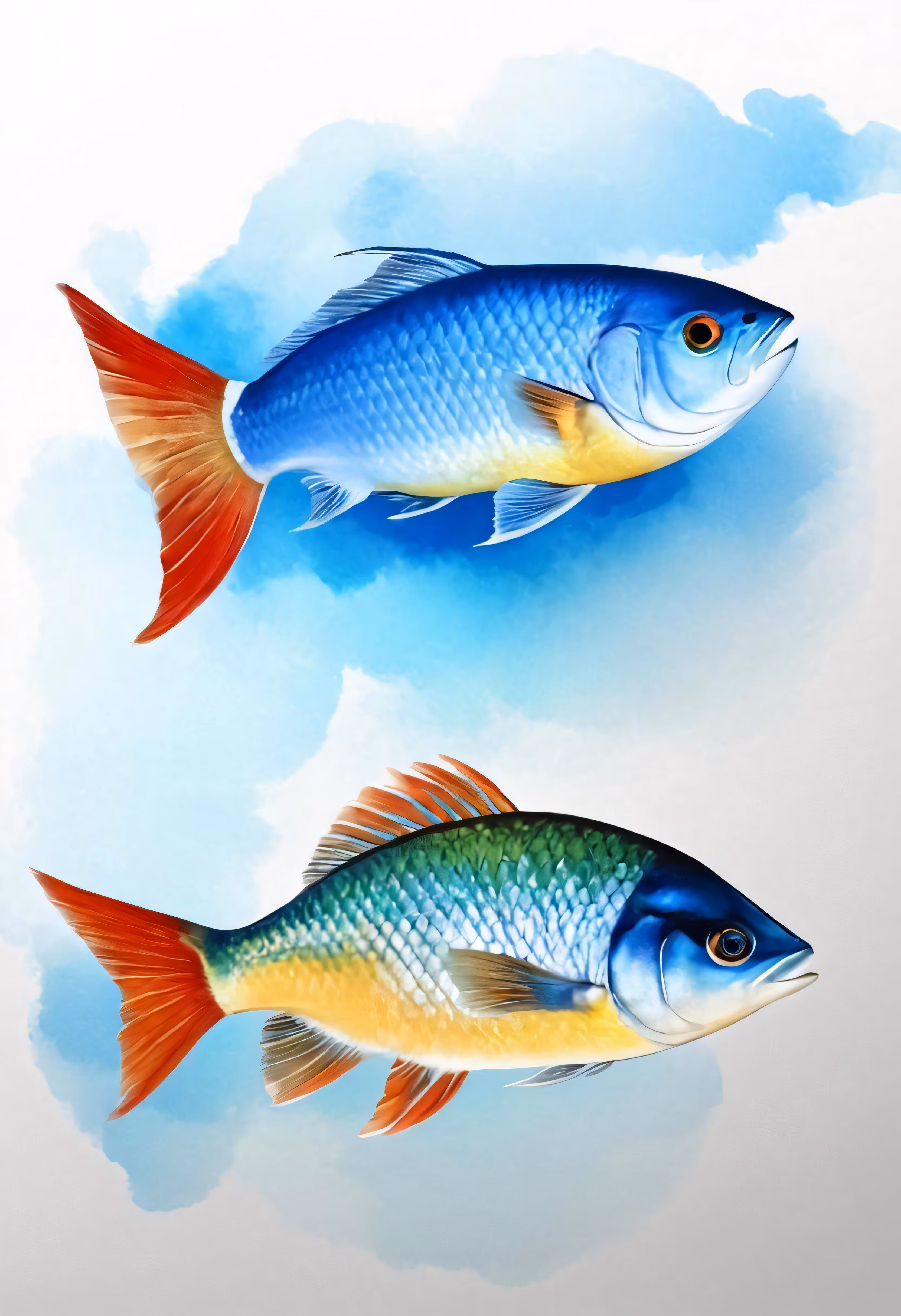 High resolution picture, free to use, two fish in the water with some clouds behind them
