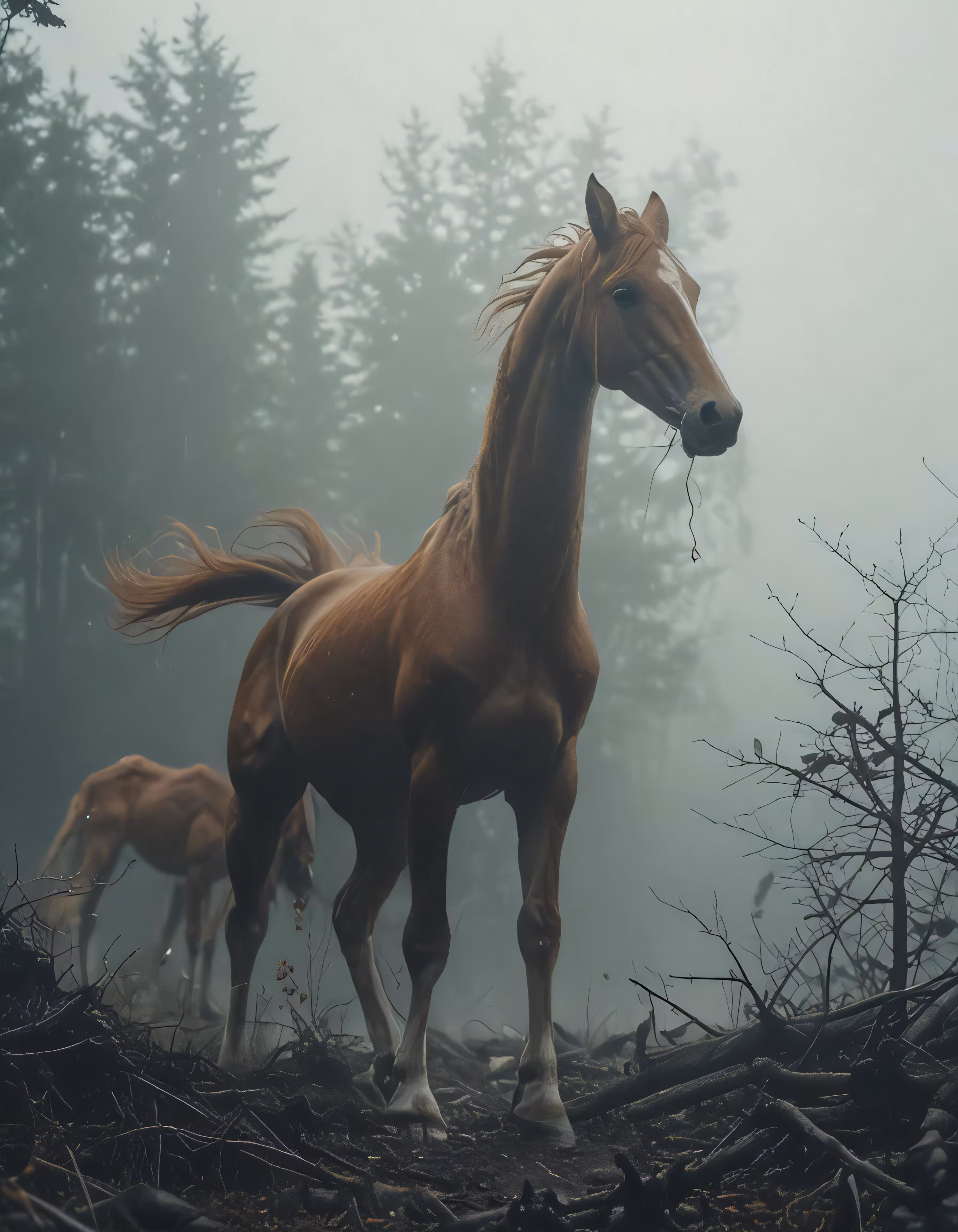 High resolution picture, free to use, two horses stand in the woods with misty trees