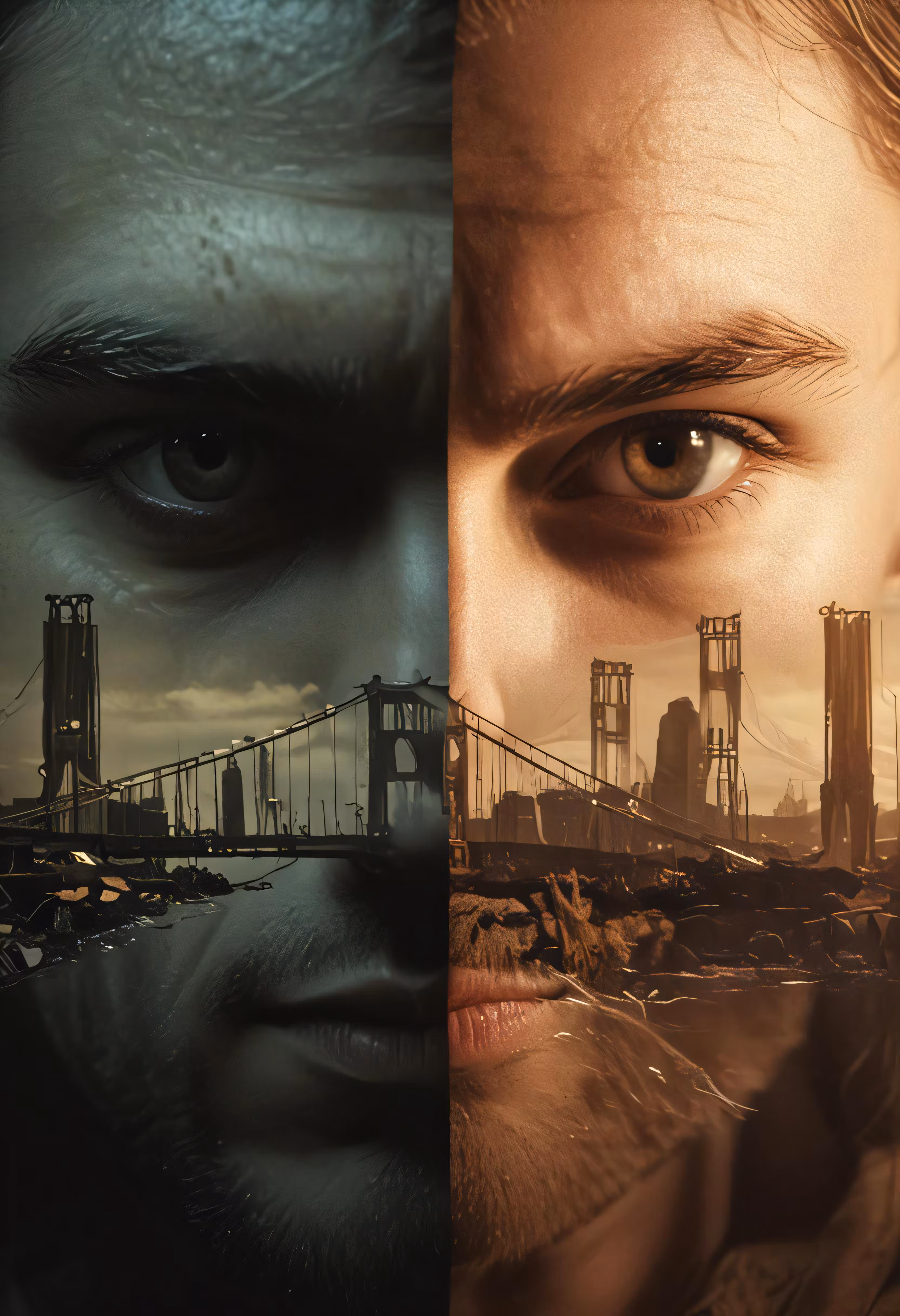 High resolution picture, free to use, two identical pictures of men one with a bridge and another with a city