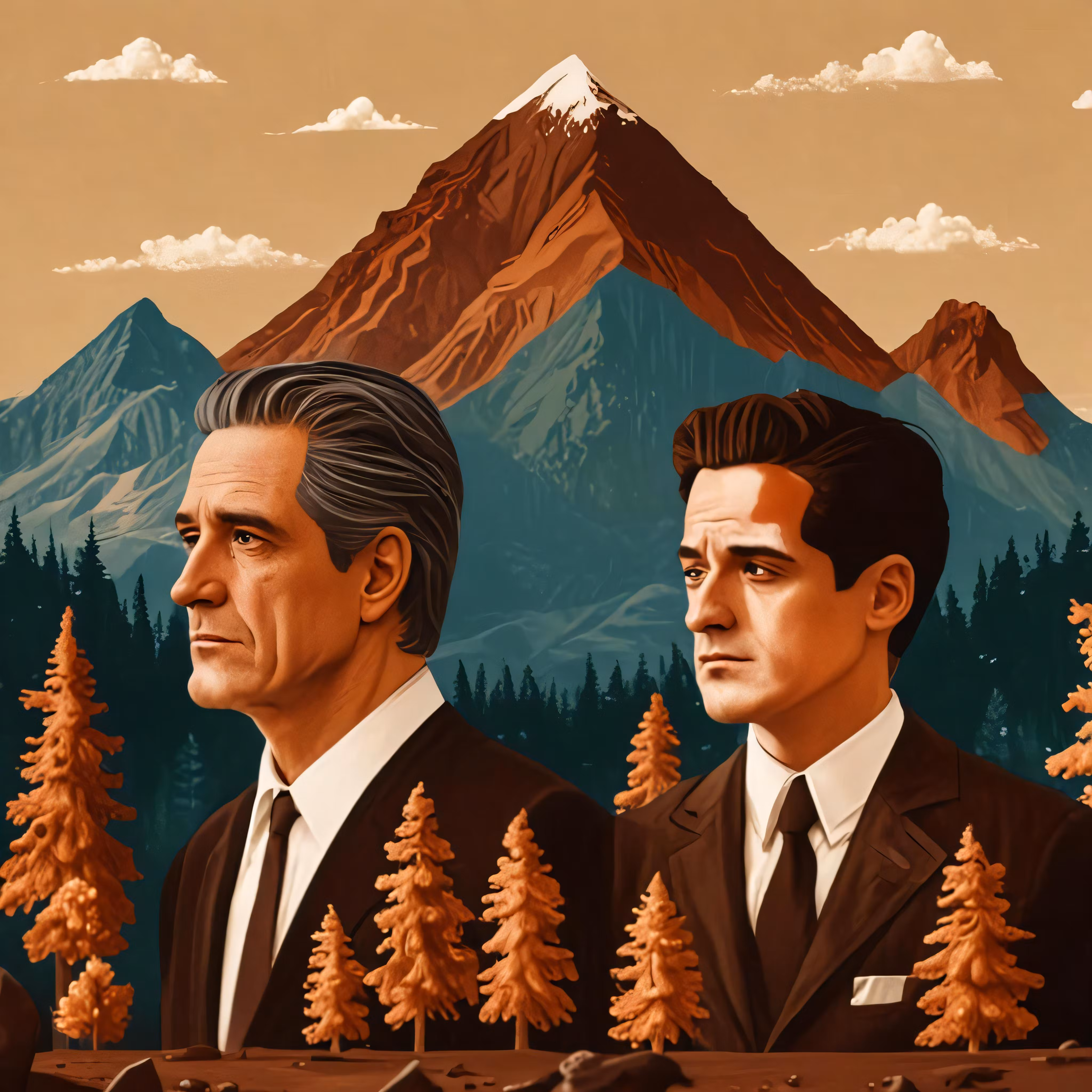 High resolution picture, free to use, two men in suits looking to each other with mountains in the background