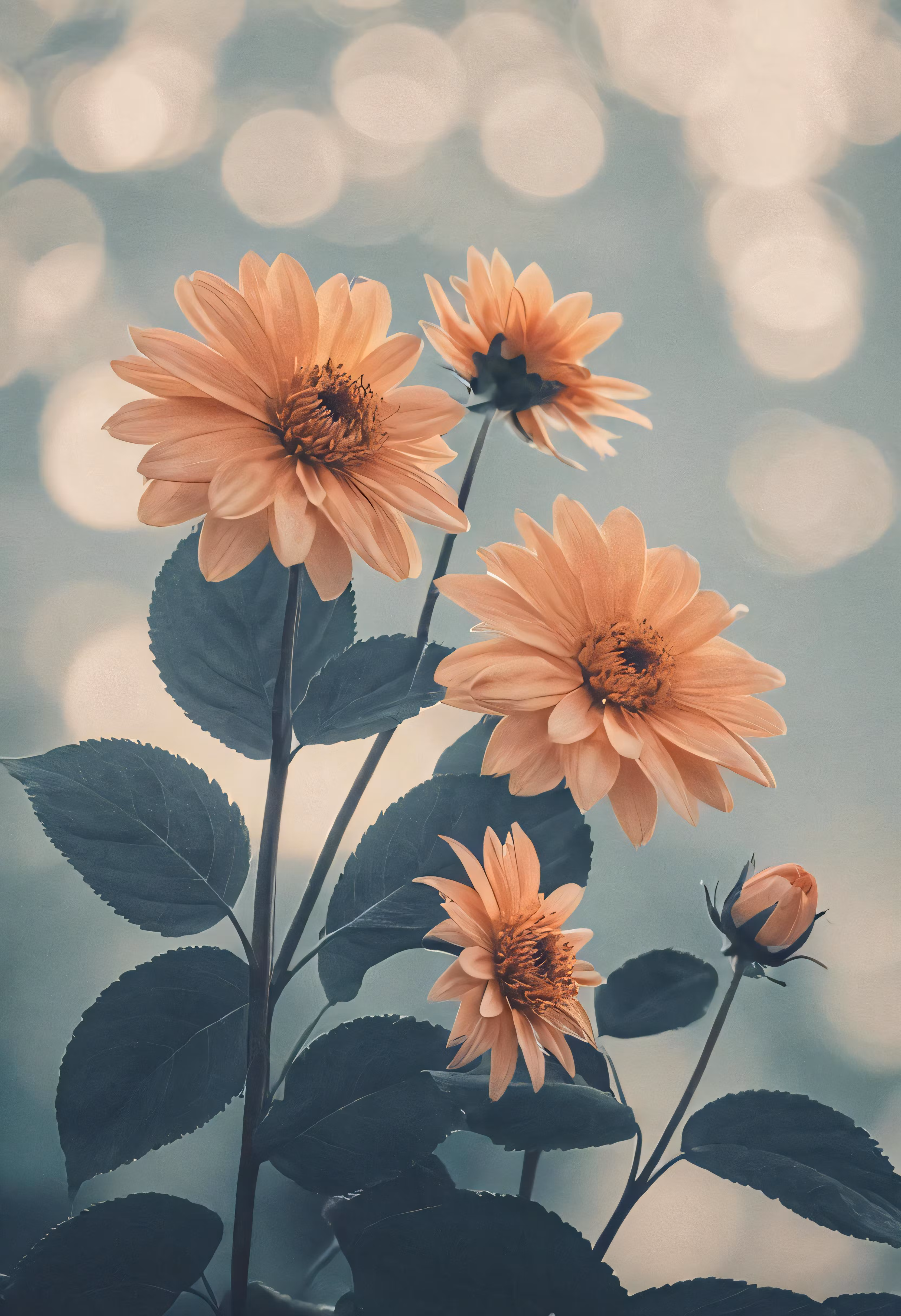 High resolution picture, free to use, two orange flowers with large, green leaves on the stem