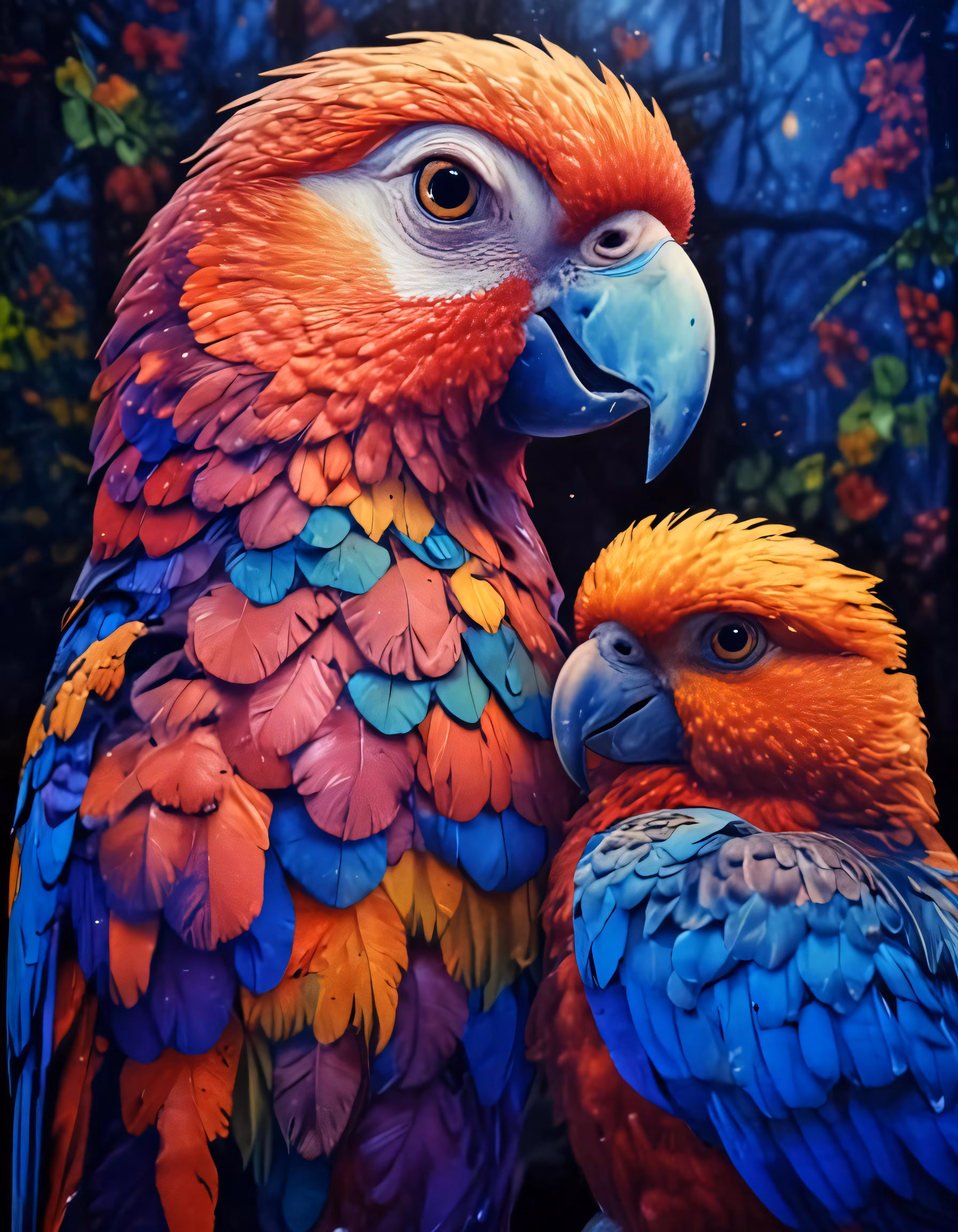 High resolution picture, free to use, two parrots with red, blue and yellow feathers standing in front of an exotic background