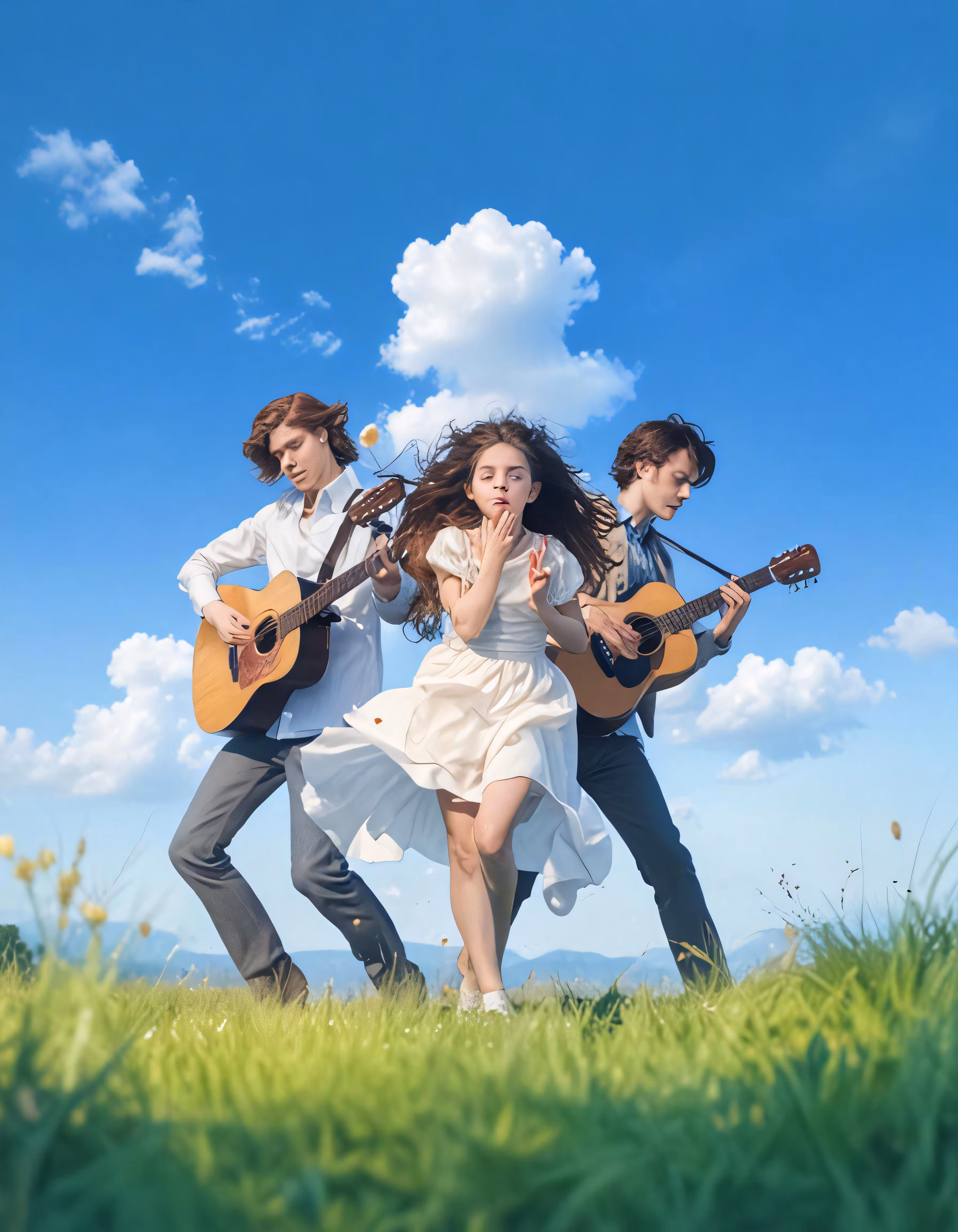 High resolution picture, free to use, two people are playing the guitar and a girl is running in a field