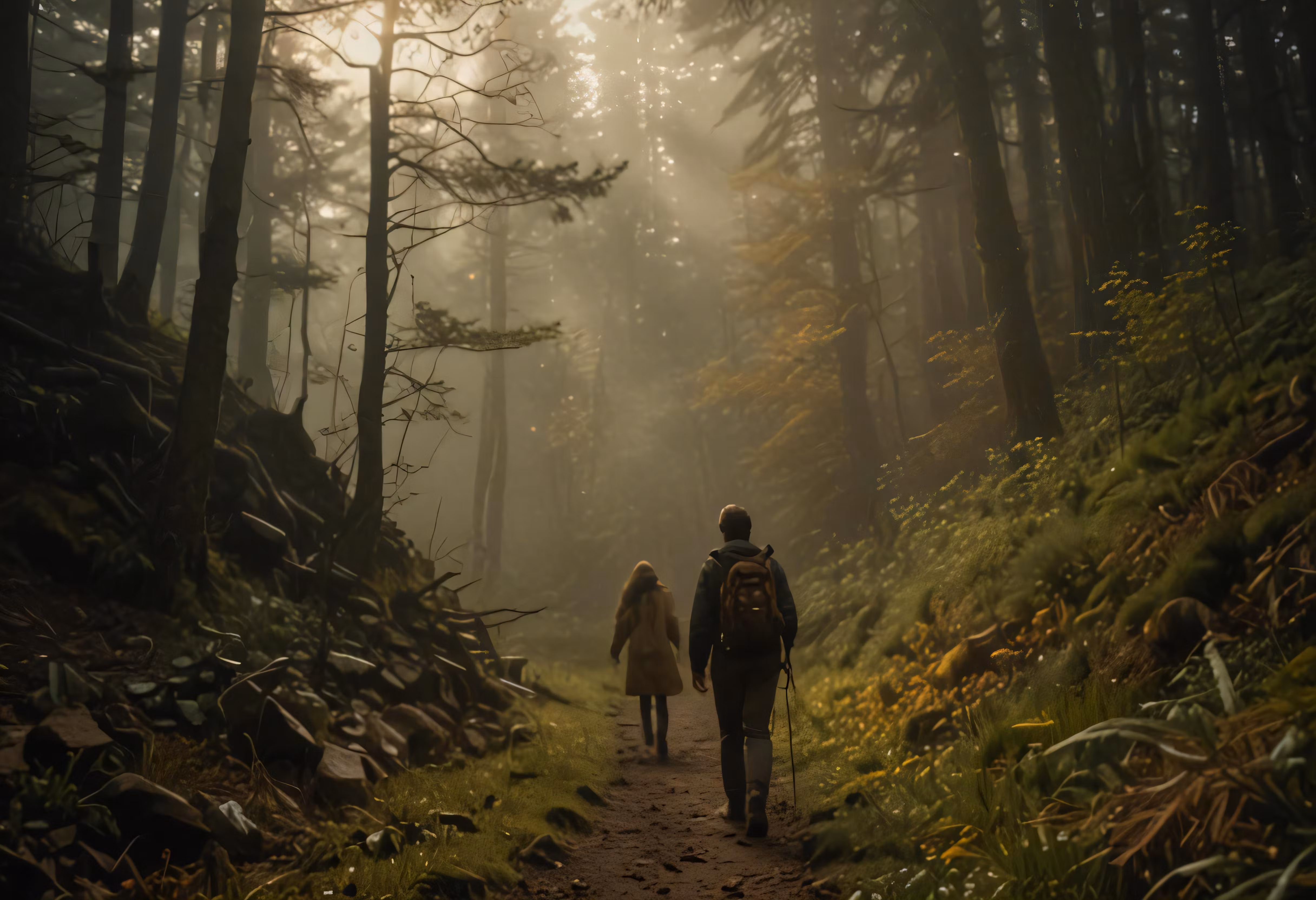 High resolution picture, free to use, two people on trekking together as the sun goes down in a dense forest