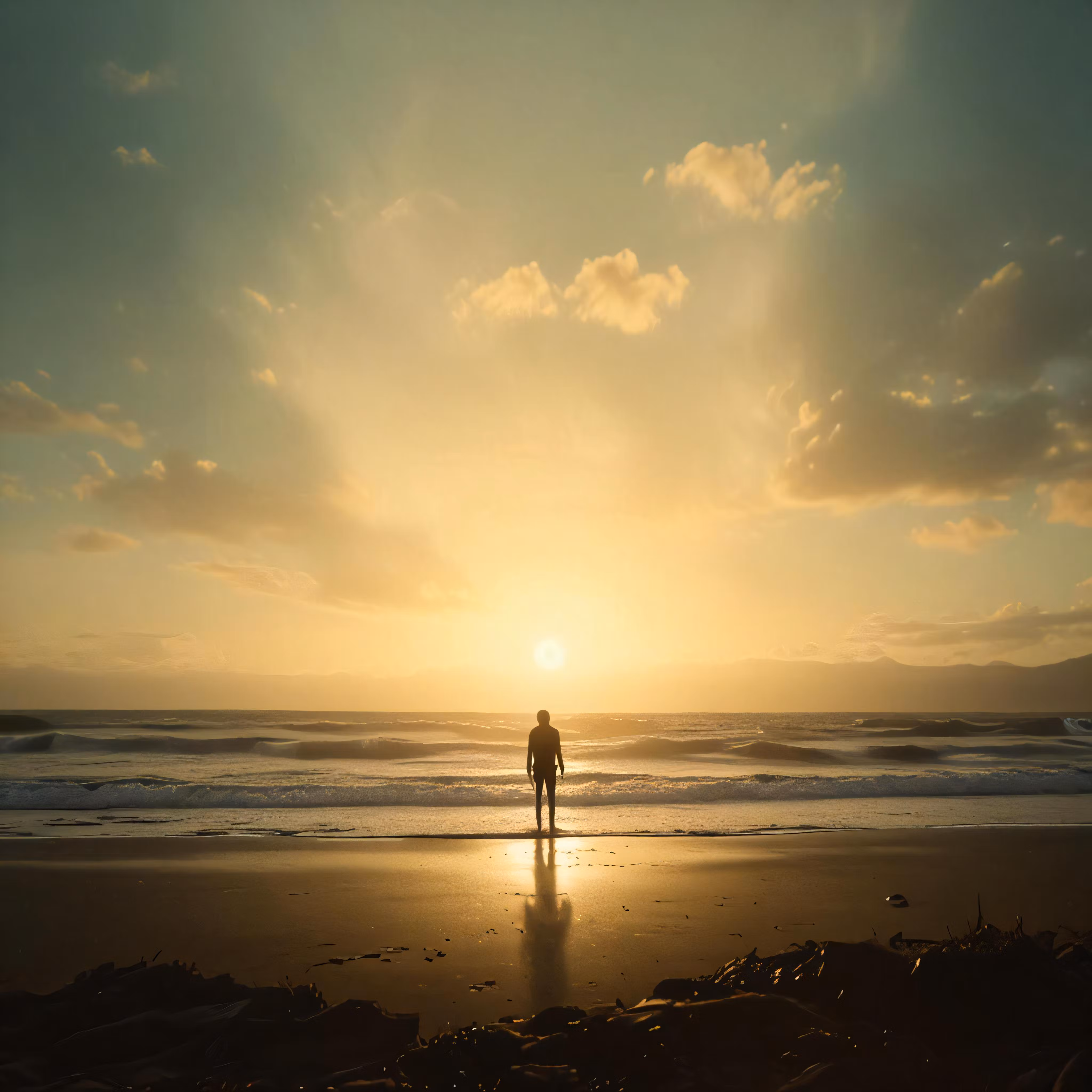 High resolution picture, free to use, two people standing on the beach with the sun shining in
