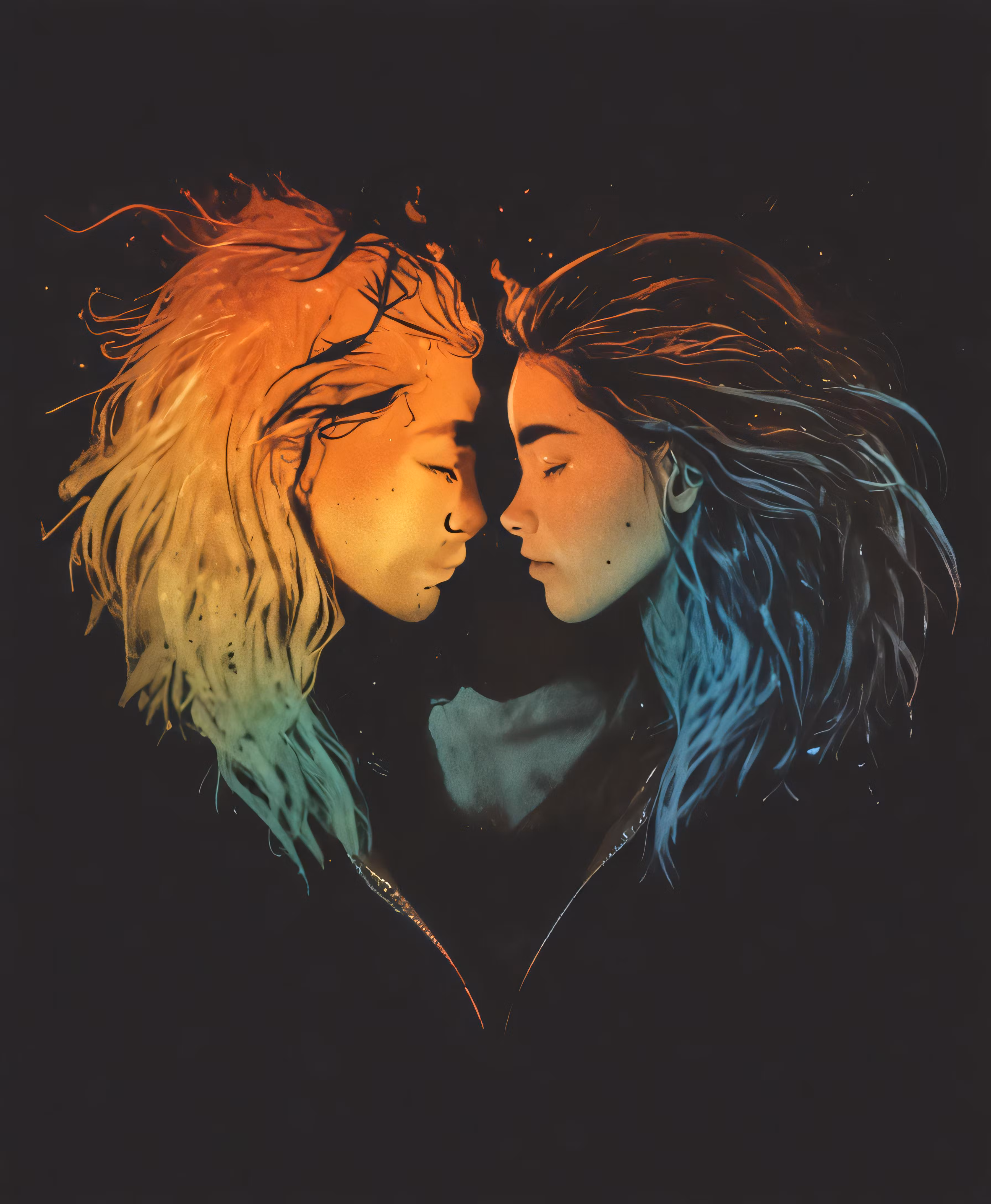 High resolution picture, free to use, two people with long hair looking at each other in the dark