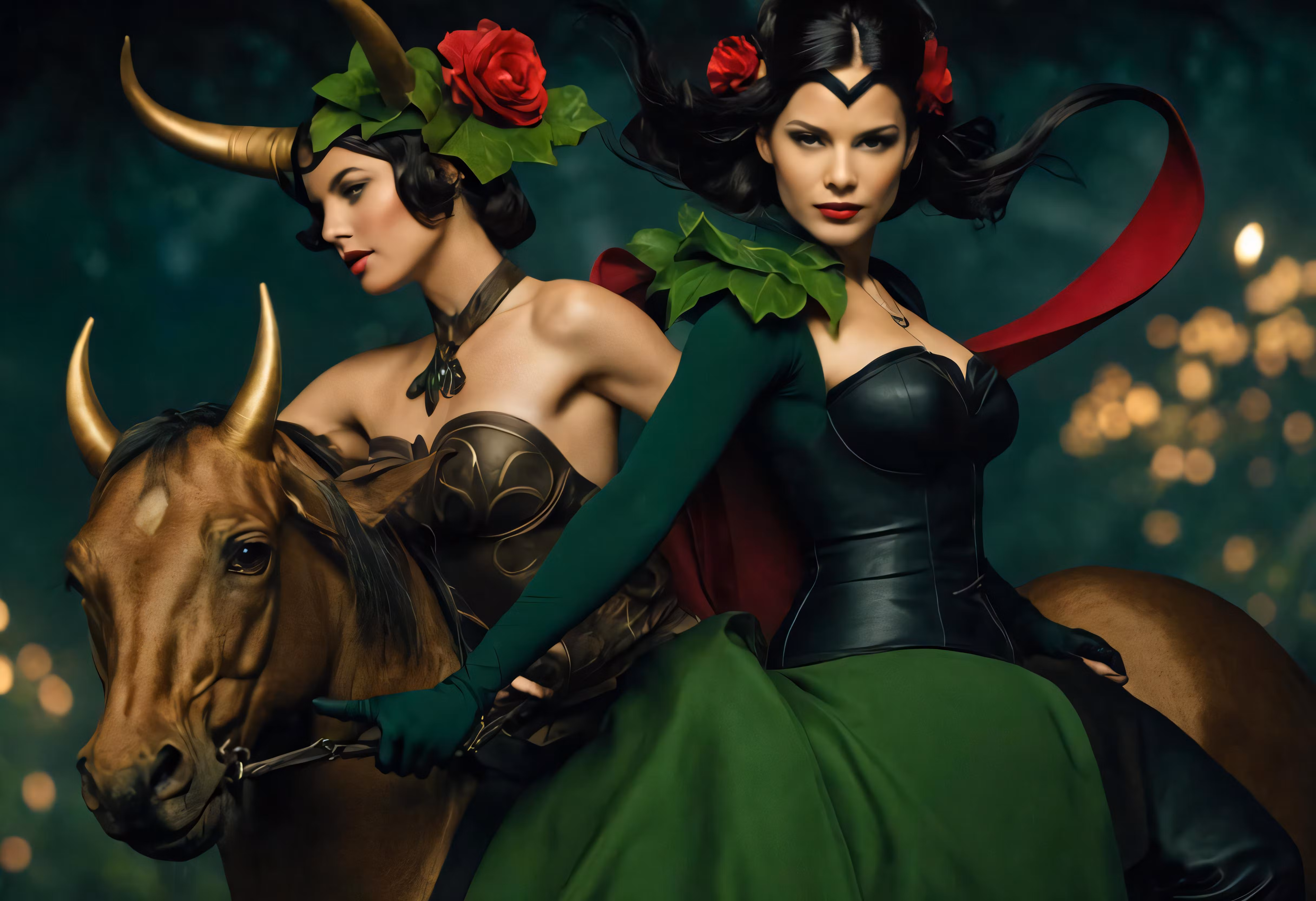 High resolution picture, free to use, two woman in full costumes sitting on top of a horse