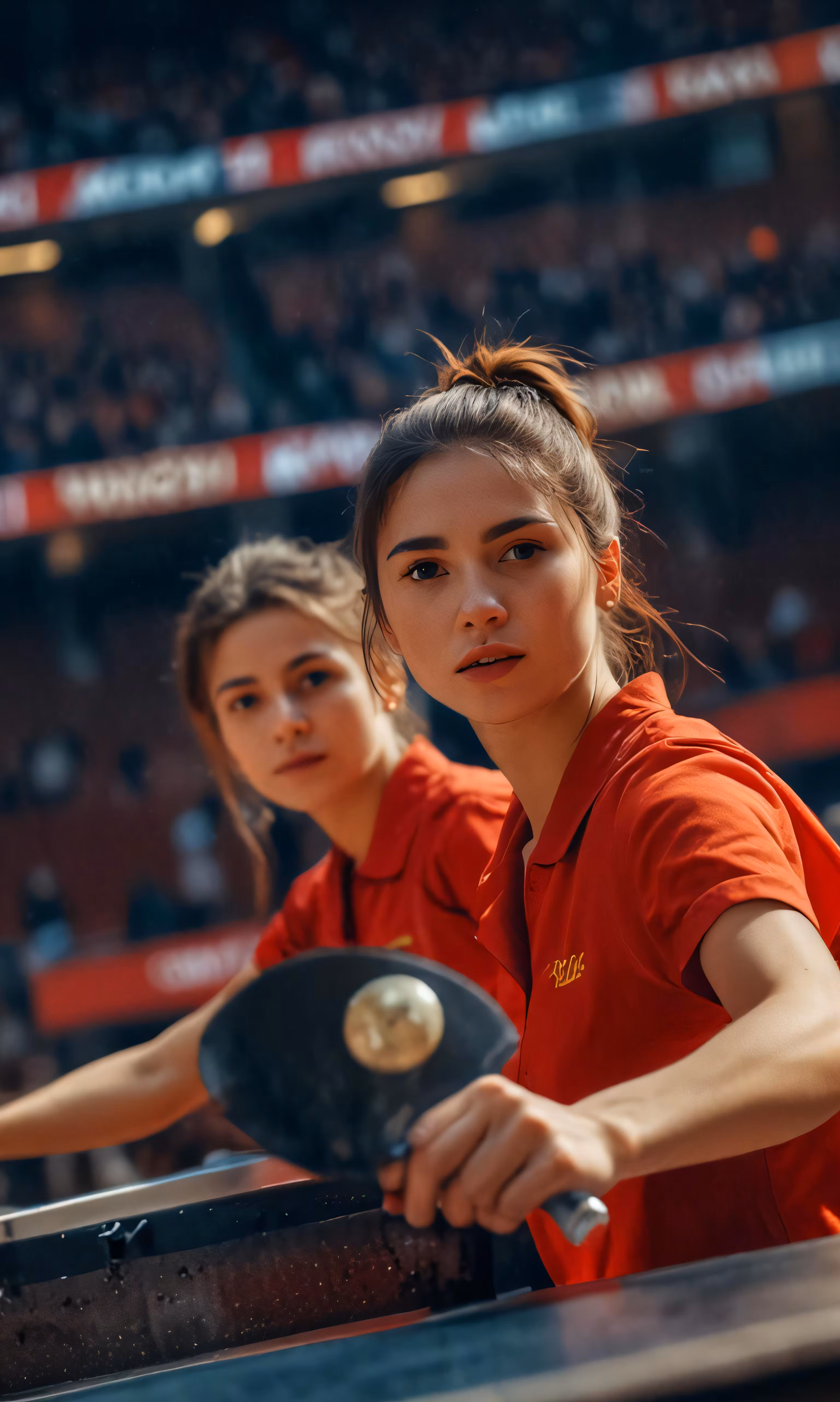High resolution picture, free to use, two women in red shirts are playing ping pong