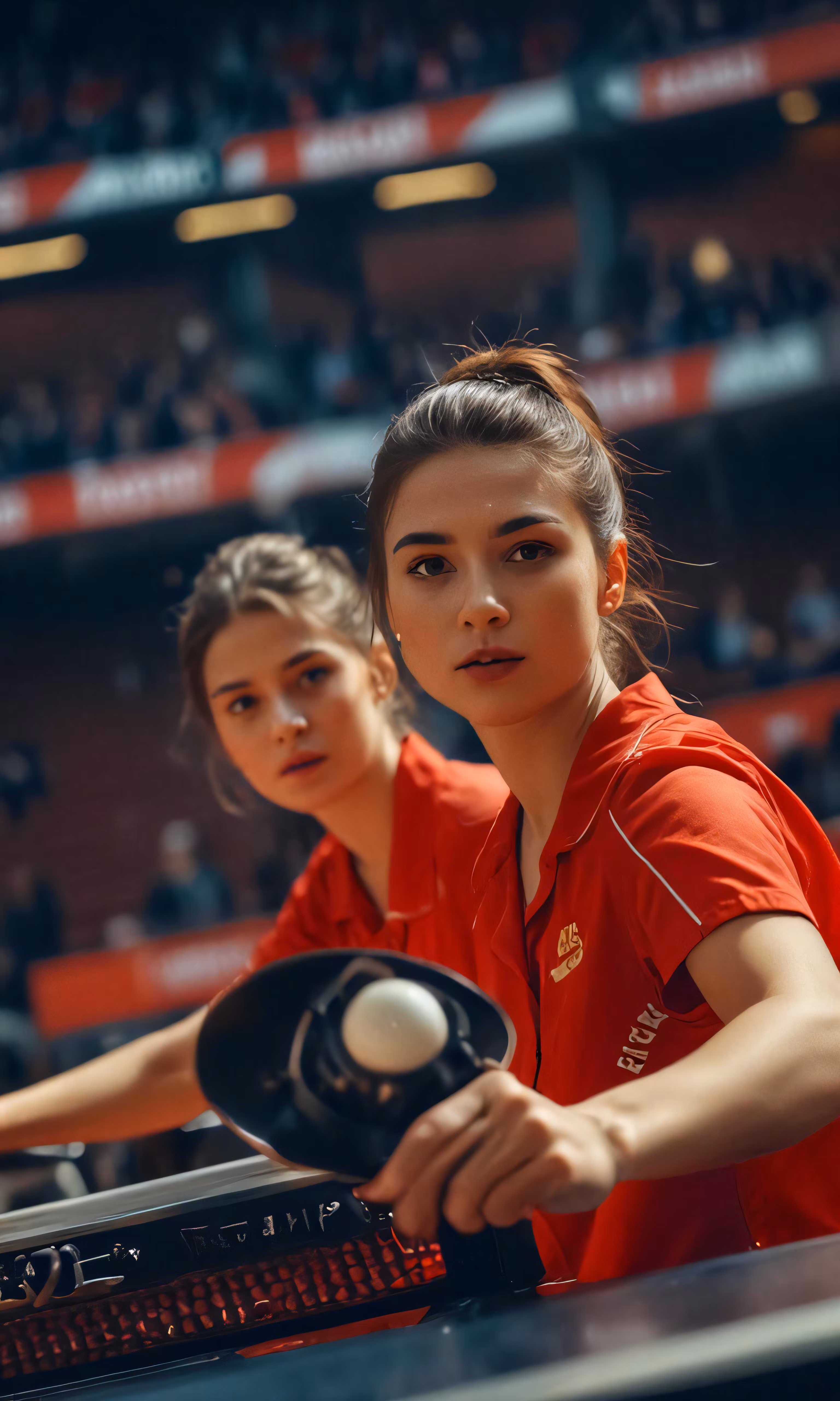 High resolution picture, free to use, two women play ping pong in a big sports arena