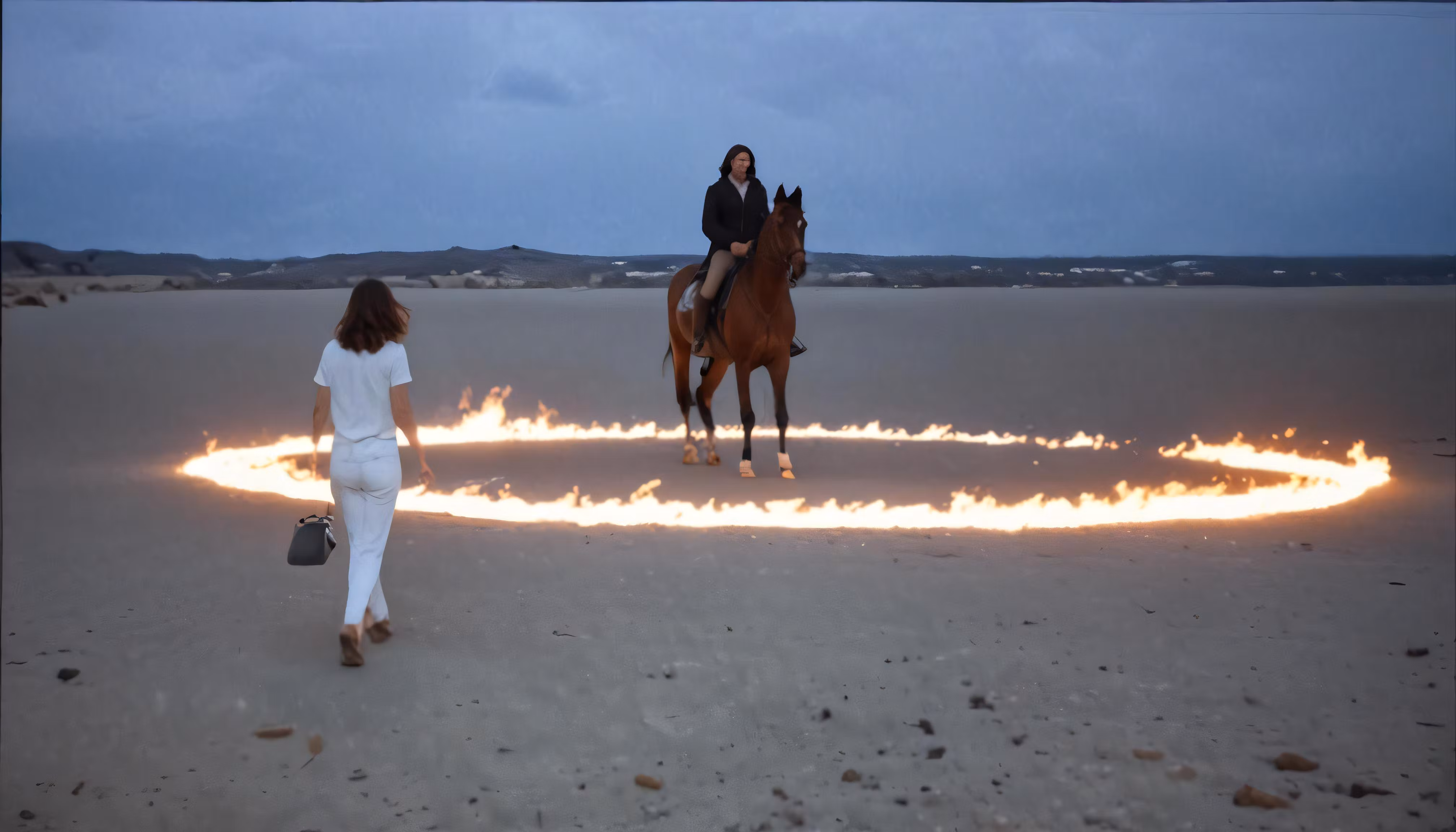 High resolution picture, free to use, two women ride horses and appear to be surrounded by flames
