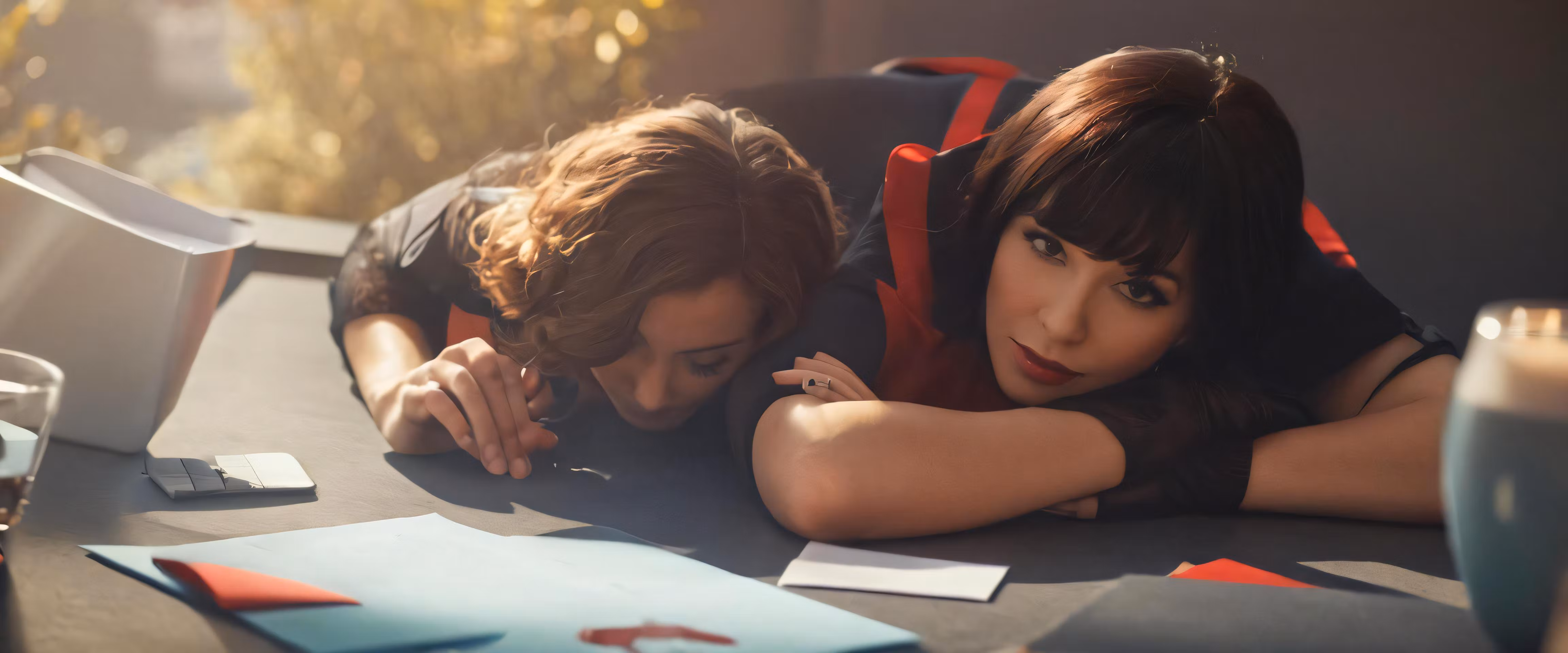 High resolution picture, free to use, two young people sitting on a desk next to papers