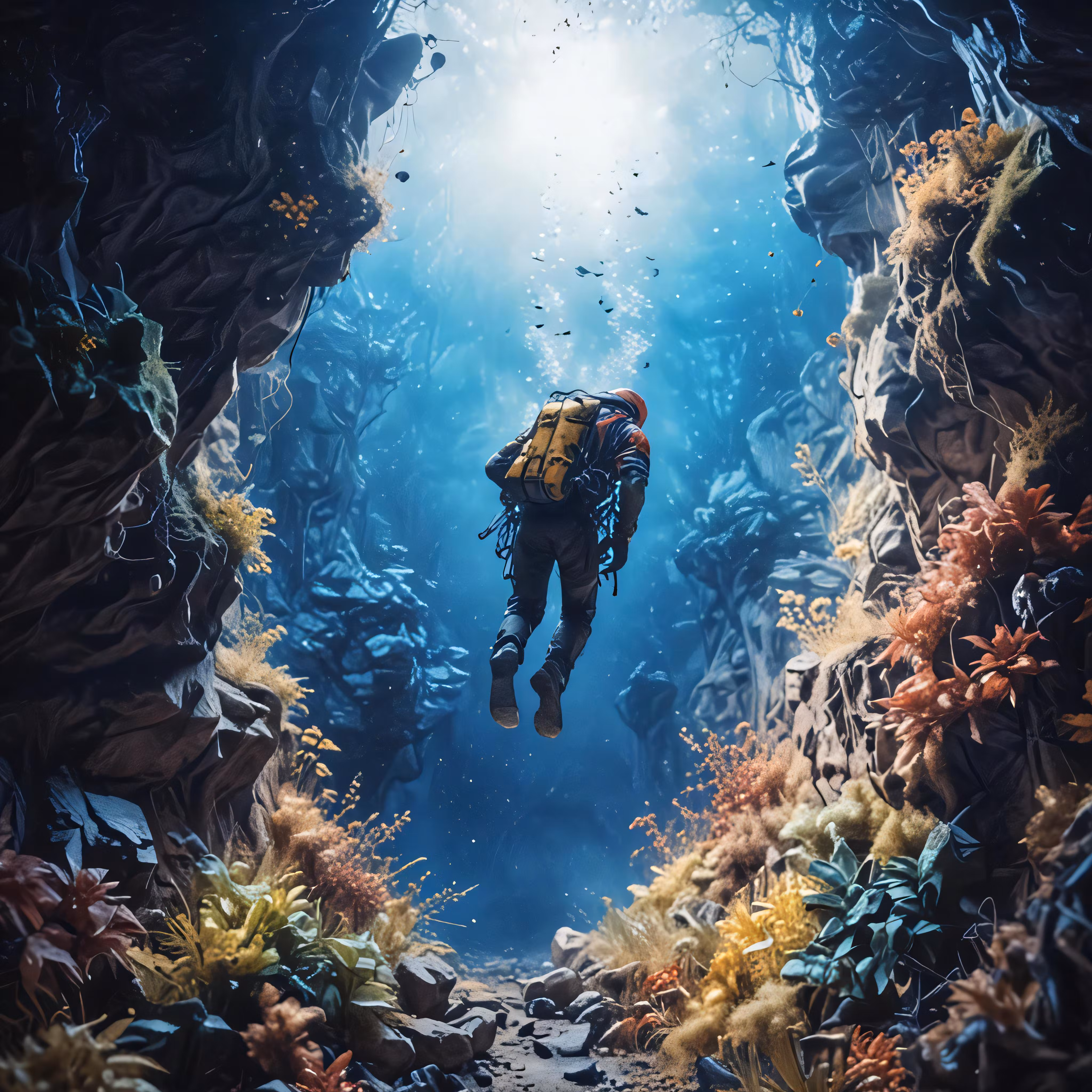 High resolution picture, free to use, underwater scuba diver ascending from the bottom of an aquarium