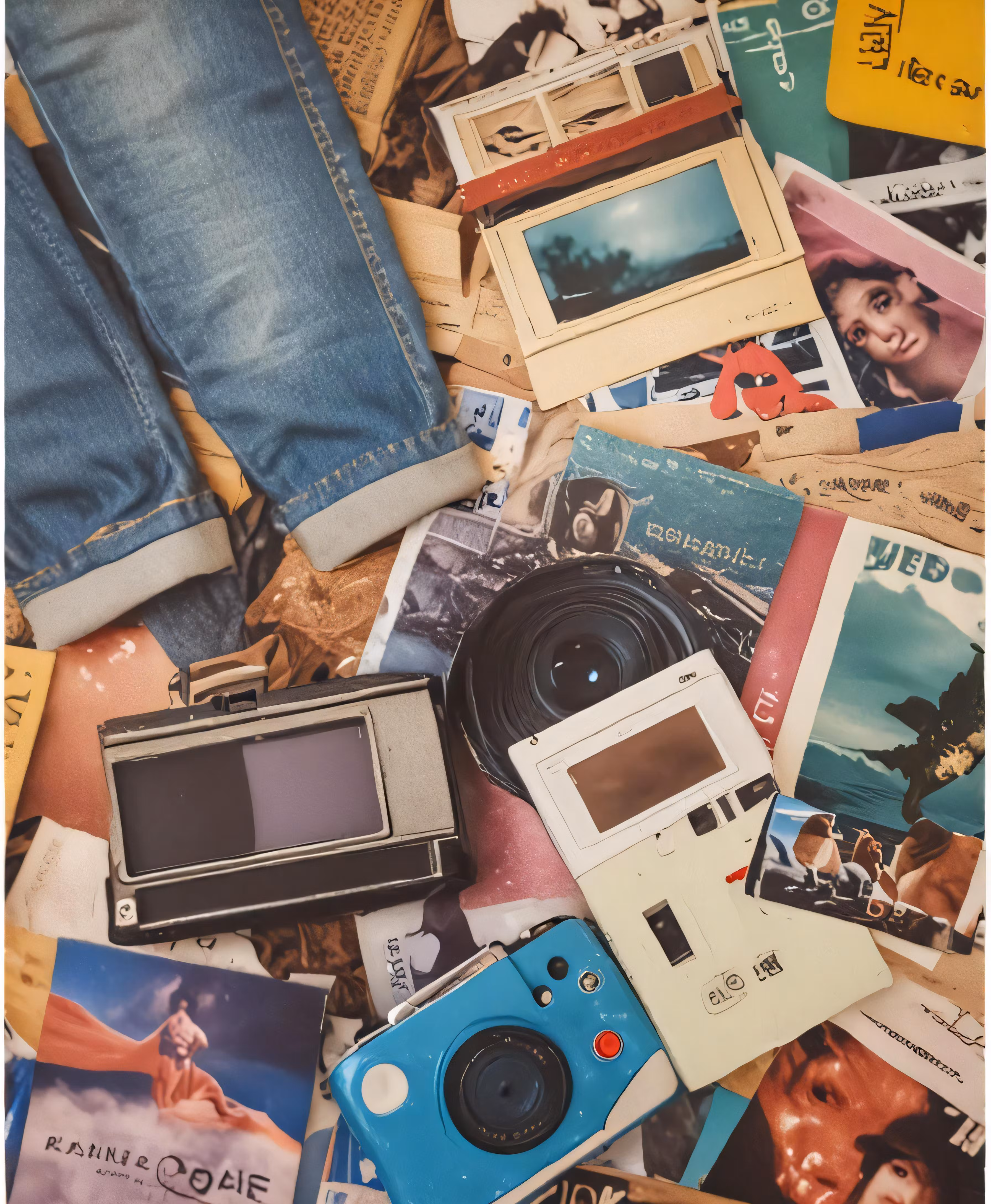 High resolution picture, free to use, various old fashioned items and a camera are on the floor