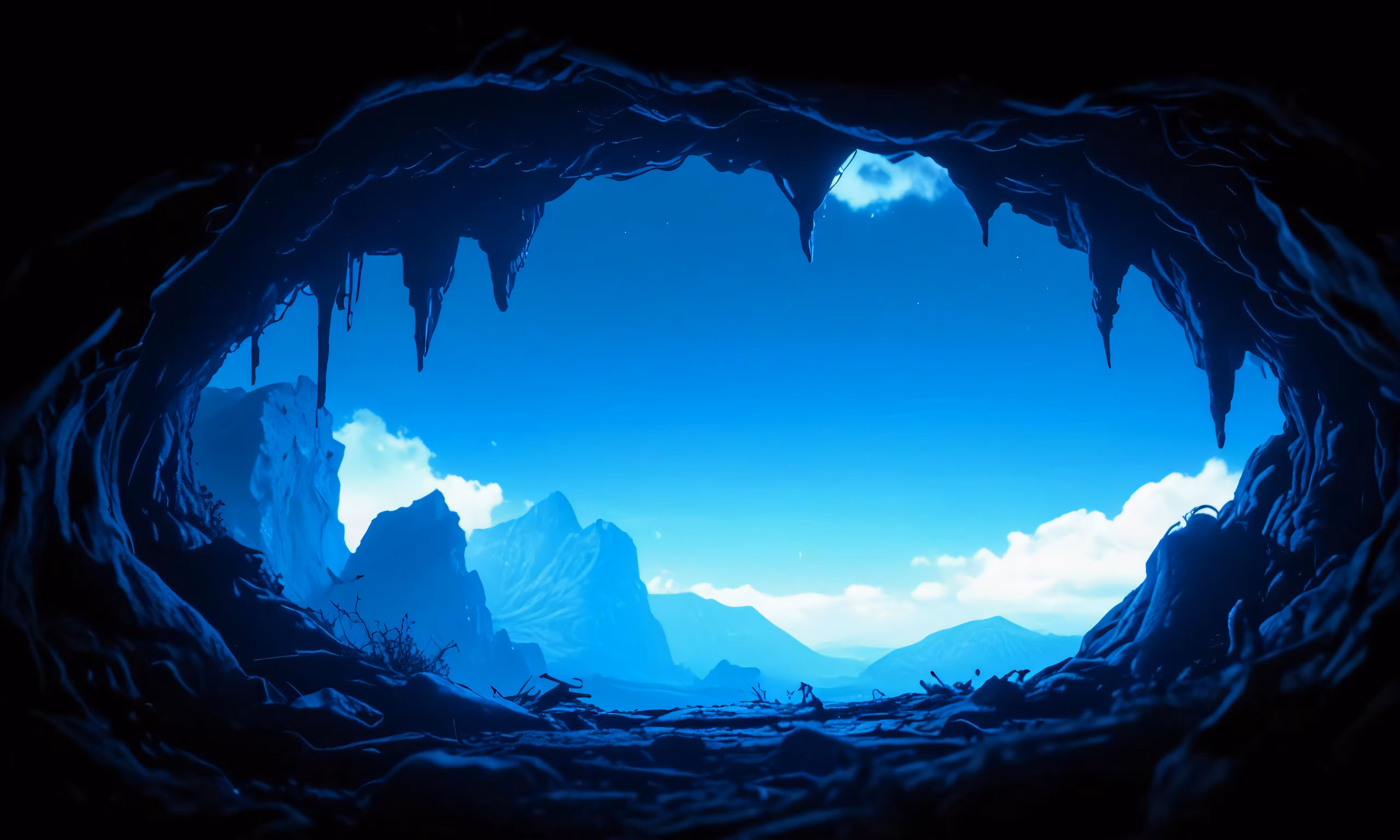 High resolution picture, free to use, view of a mountain from inside a cave in a dark place