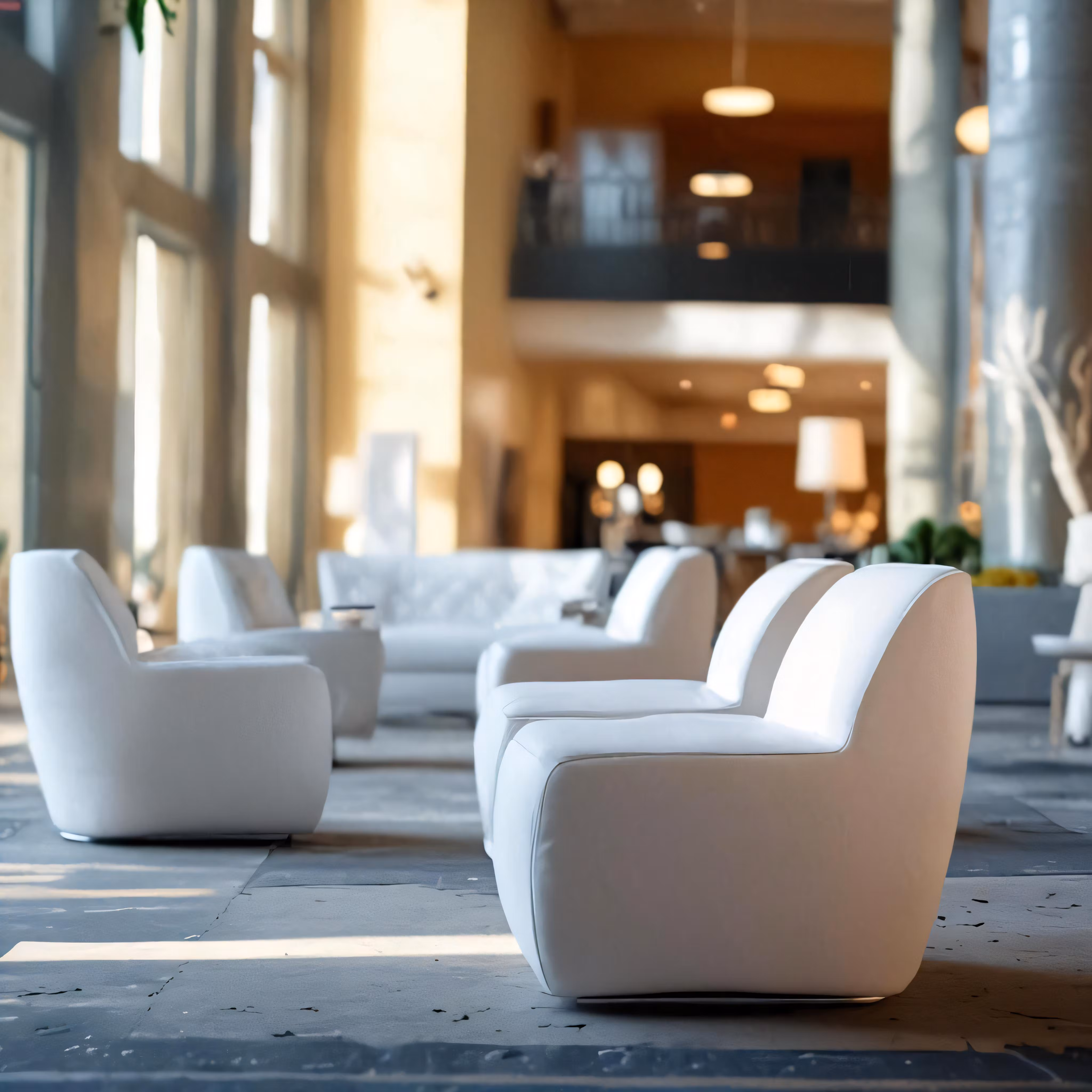 High resolution picture, free to use, white chairs sitting on cement floors in a large building