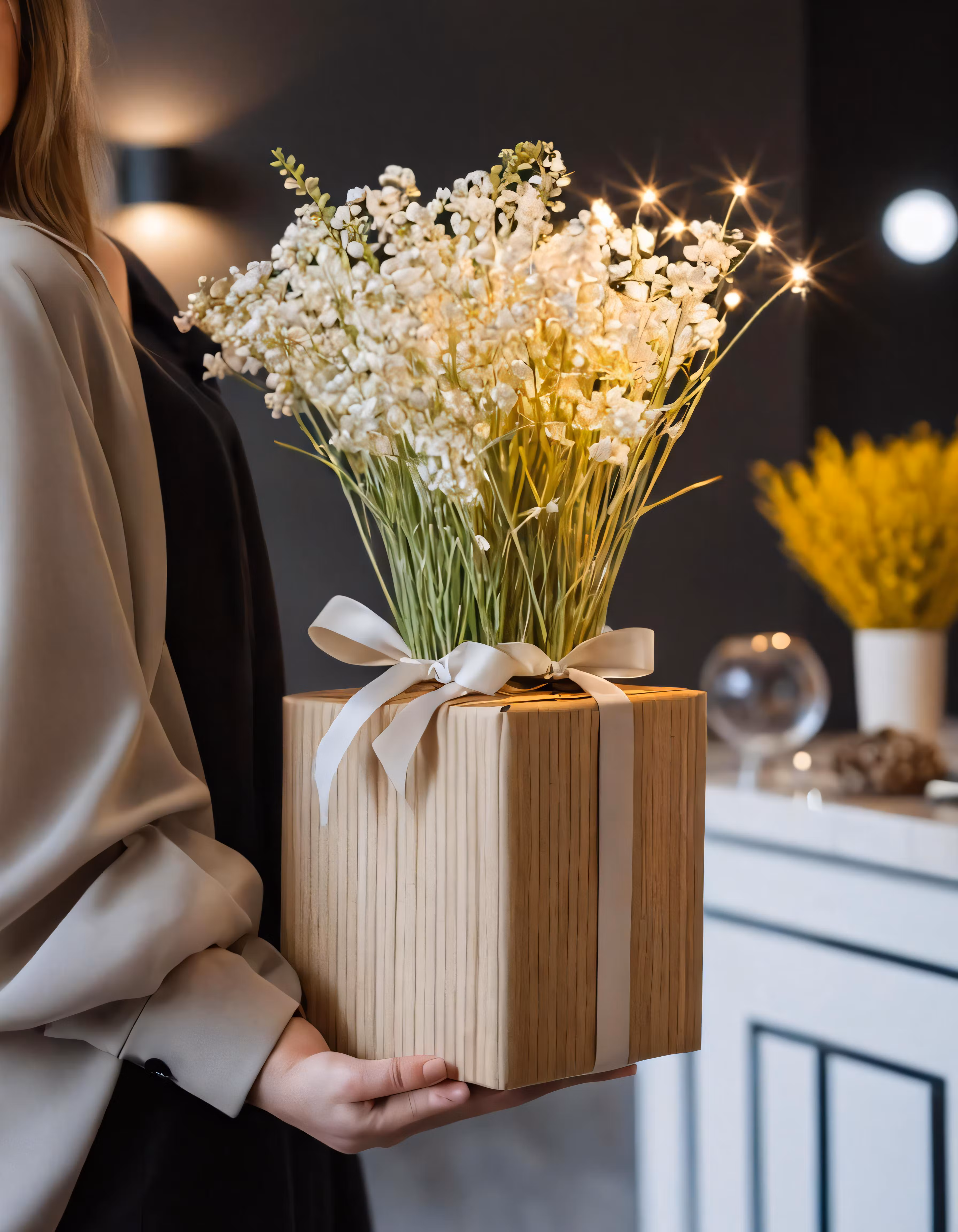 High resolution picture, free to use, white flowers wrapped in brown paper and lighted by fairy lights are placed on a wood block